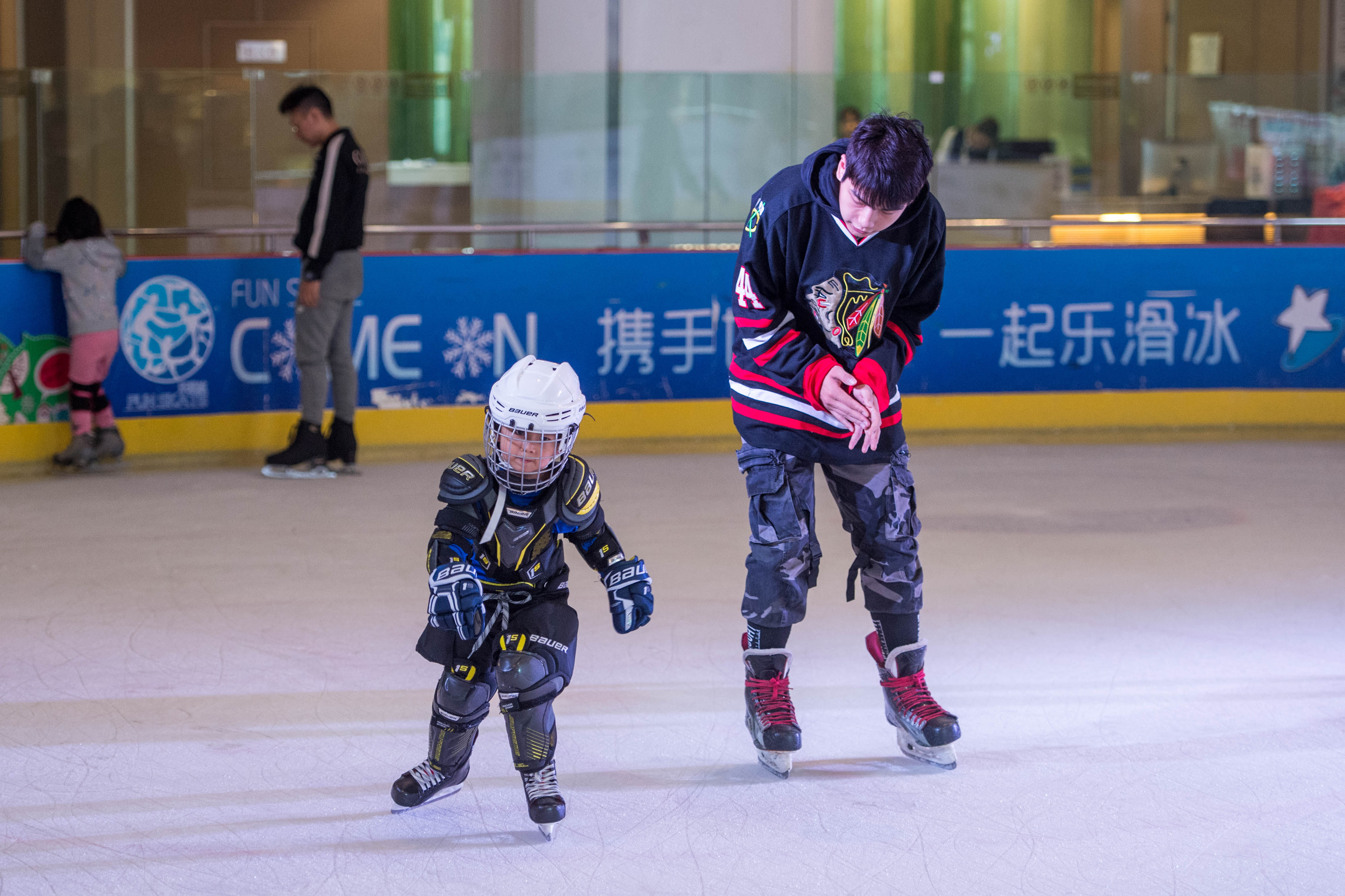 2018年10月5日,在云南省昆明市世纪星真冰场,教练在指导孩子学习滑冰。新华社记者胡超摄
