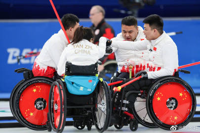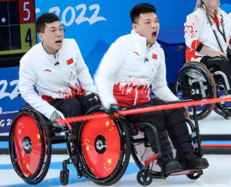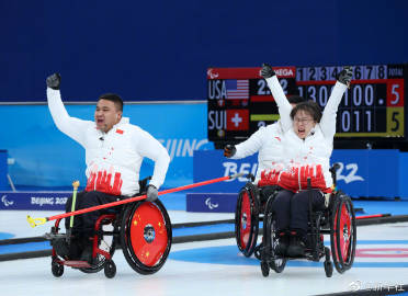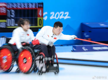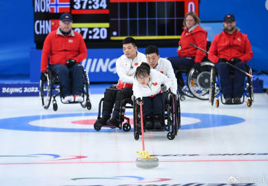 【#轮椅冰壶循环赛中国队胜挪威队#】3月9日,在北京国家游泳中心“冰立方”举行的北京2022年冬残奥会轮椅冰壶循环赛中,中国队以7比4战胜挪威队。(摄影:兰红光、张可任、张博文)