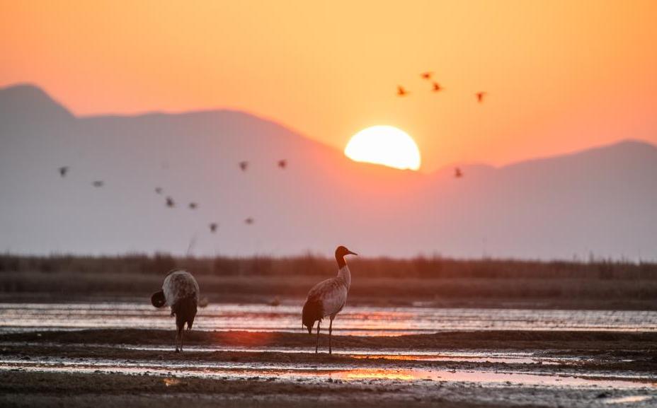 随着天气逐渐转暖,在贵州草海国家级自然保护区越冬的黑颈鹤、灰鹤、斑头雁等候鸟开始陆续迁徙。