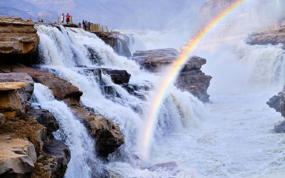 随着气温不断回升,黄河壶口瀑布水流量明显增大,在阳光的照射下,飞瀑与彩虹相映成趣,把一幅动静结合的春天画卷展现在游客眼前。