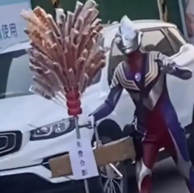 ·河南郑州男子街头扮奥特曼卖糖葫芦遭劝离,当地城管:其行为构成违规占道经营,和他所穿的服装无关。