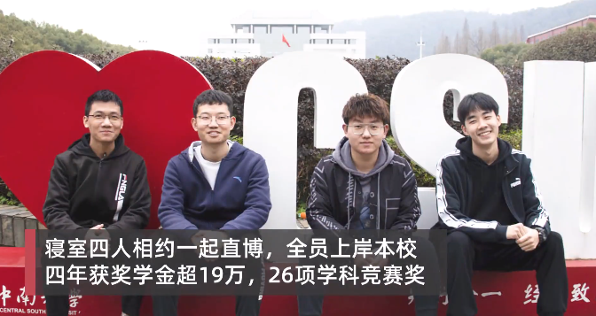 中南大学自动化学院18级同宿舍4位男生全员直博本校。目前,他们已获得近20万奖学金,狂揽各级26项学科竞赛奖。