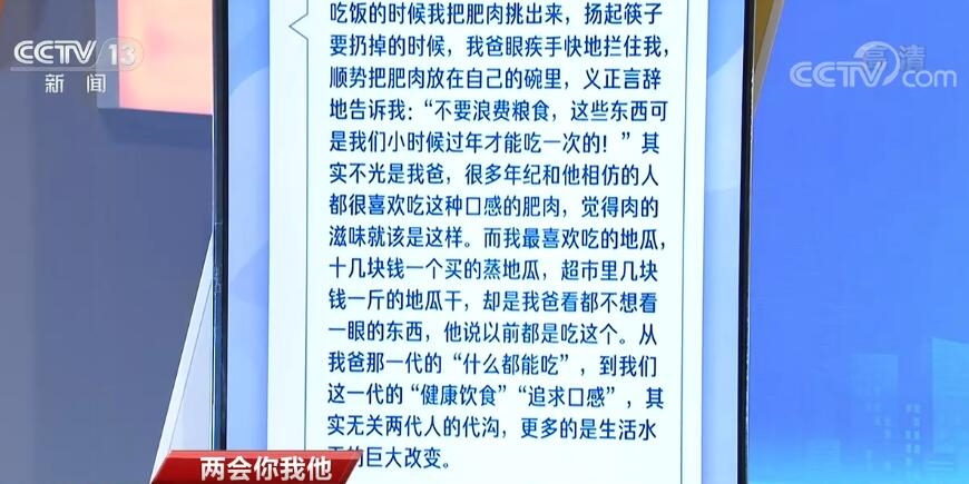 网友热议中国近几十年来餐桌饮食上的变化,也谈到了节约粮食的问题,其中的一句话“节约好粮食就是对前辈们最好的纪念”让人深有感触。
