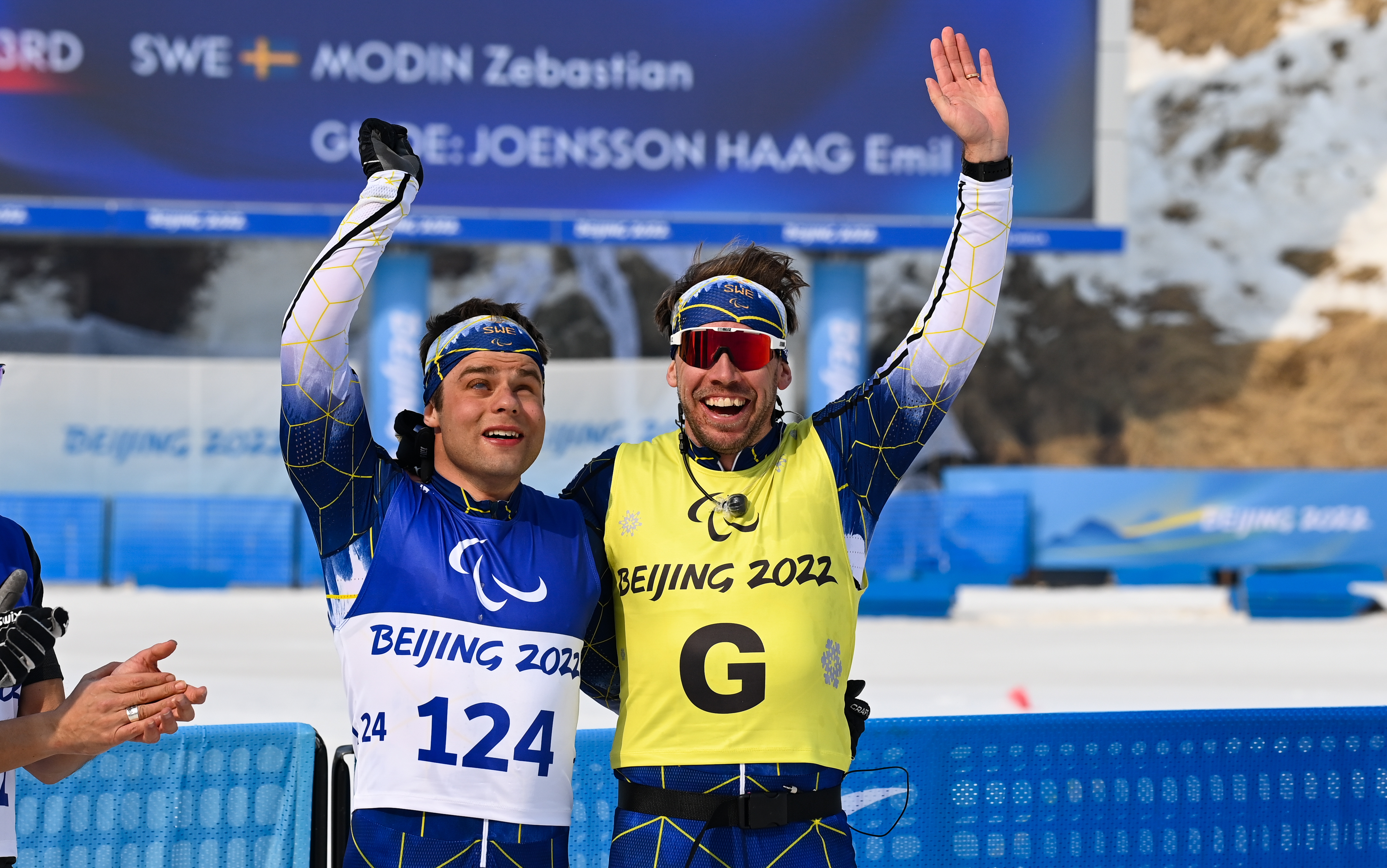 新华社照片,张家口(河北),2022年3月10日 (新华全媒+·北京冬残奥会)(17)“你是我的眼” 在残奥越野滑雪男子短距离自由技术(视障)比赛后,季军瑞典选手塞巴斯蒂安·莫丁(左)和引导员埃米尔·延松向现场观众致意(3月9日摄)。 视障运动员参与残奥越野滑雪、残奥冬季和残奥高山滑雪比赛时,须在引导员的帮助下,合力完成。他们共同追逐梦想、挑战自我,分享快乐和荣誉。 北京2022年冬残奥会赛场国家冬季两项中心的雪道蜿蜒起伏于山谷间。在视障组比赛中,总能见到视障选手和引导员同牵一根雪杖的场景,也时常听到不同语言的提示声、发力的喘息声,这些昂扬向上的姿态令人动容。 引导员滑行在前,随时关注身后运动员的状态,他们通过扩音器或对讲机发声,提示运动员掌握方向和节奏;有时,为顺利滑过特殊赛段,引导员会适时向后伸出雪杖,视障选手则默契地握紧雪杖,两人按着相近的频率,向着终点前进。 在奖牌颁发仪式上,引导员与视障运动员会一起登上领奖台,并获得奖牌。这不仅是对运动员成绩的肯定,也是给引导员与运动员这对特殊搭档的尊重。 有视障运动员这样评价自己的引导员:“他(她)相当于我的眼睛,我们之间必须相互信任。” 新华社记者 杨冠宇 摄