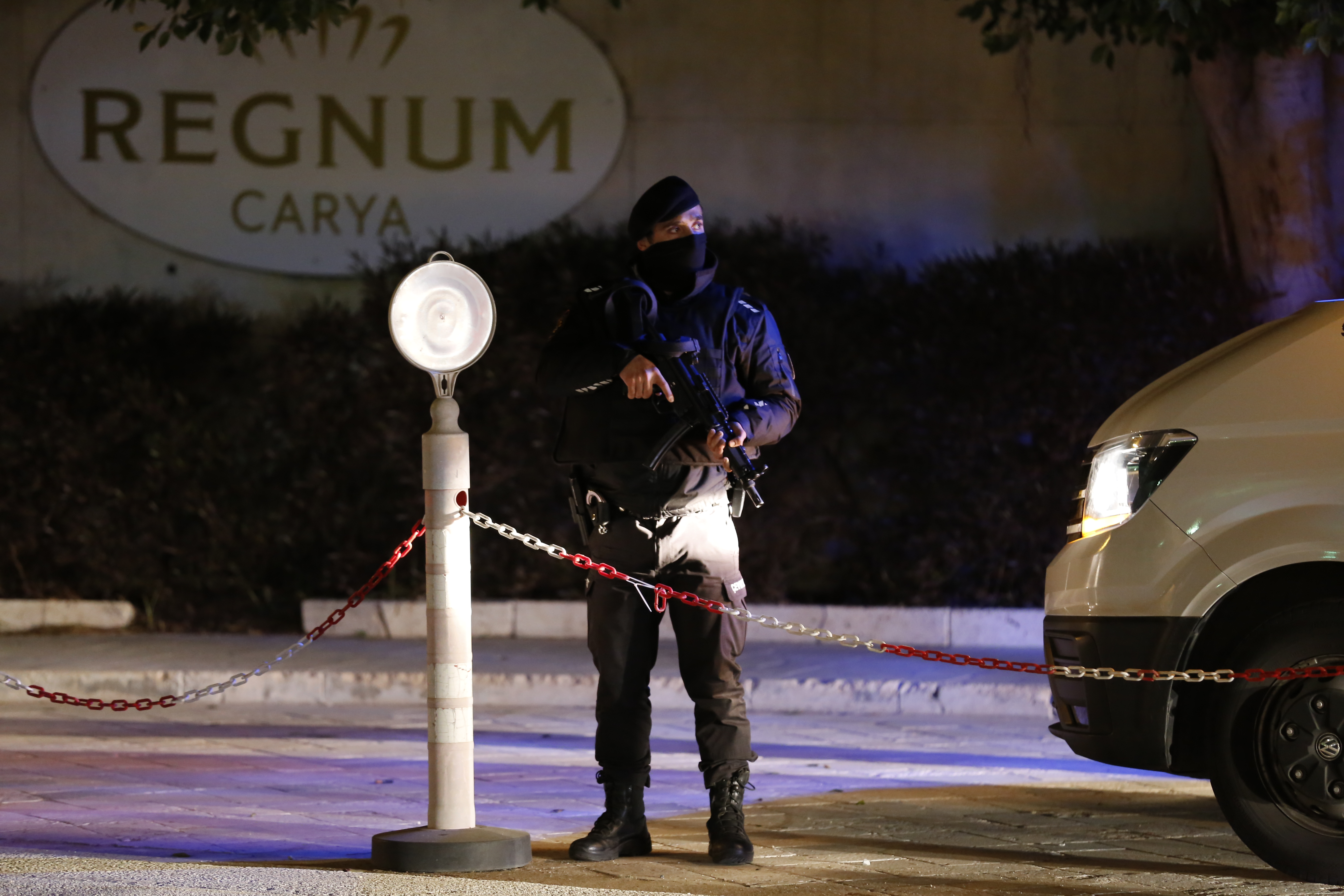 新华社照片,安塔利亚(土耳其),2022年3月10日 (乌克兰局势)乌俄外长将举行会谈 3月9日,在土耳其安塔利亚,安全人员在俄罗斯外长拉夫罗夫所住酒店外警戒。 乌克兰外长库列巴9日说,10日他将与俄罗斯外长拉夫罗夫举行会谈。 新华社记者 李振北 摄