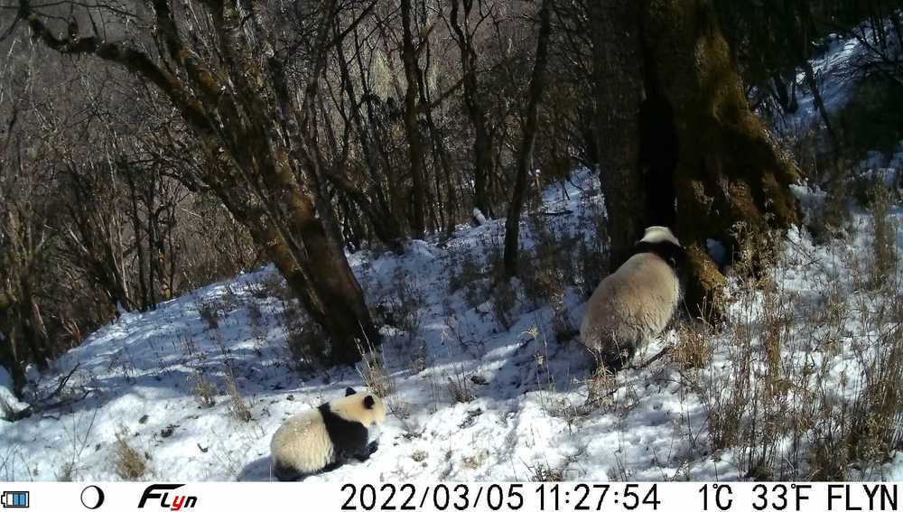 这是3月5日红外相机拍摄到的大熊猫母子照片。(图片来源:大熊猫国家公园宝兴县管护总站)