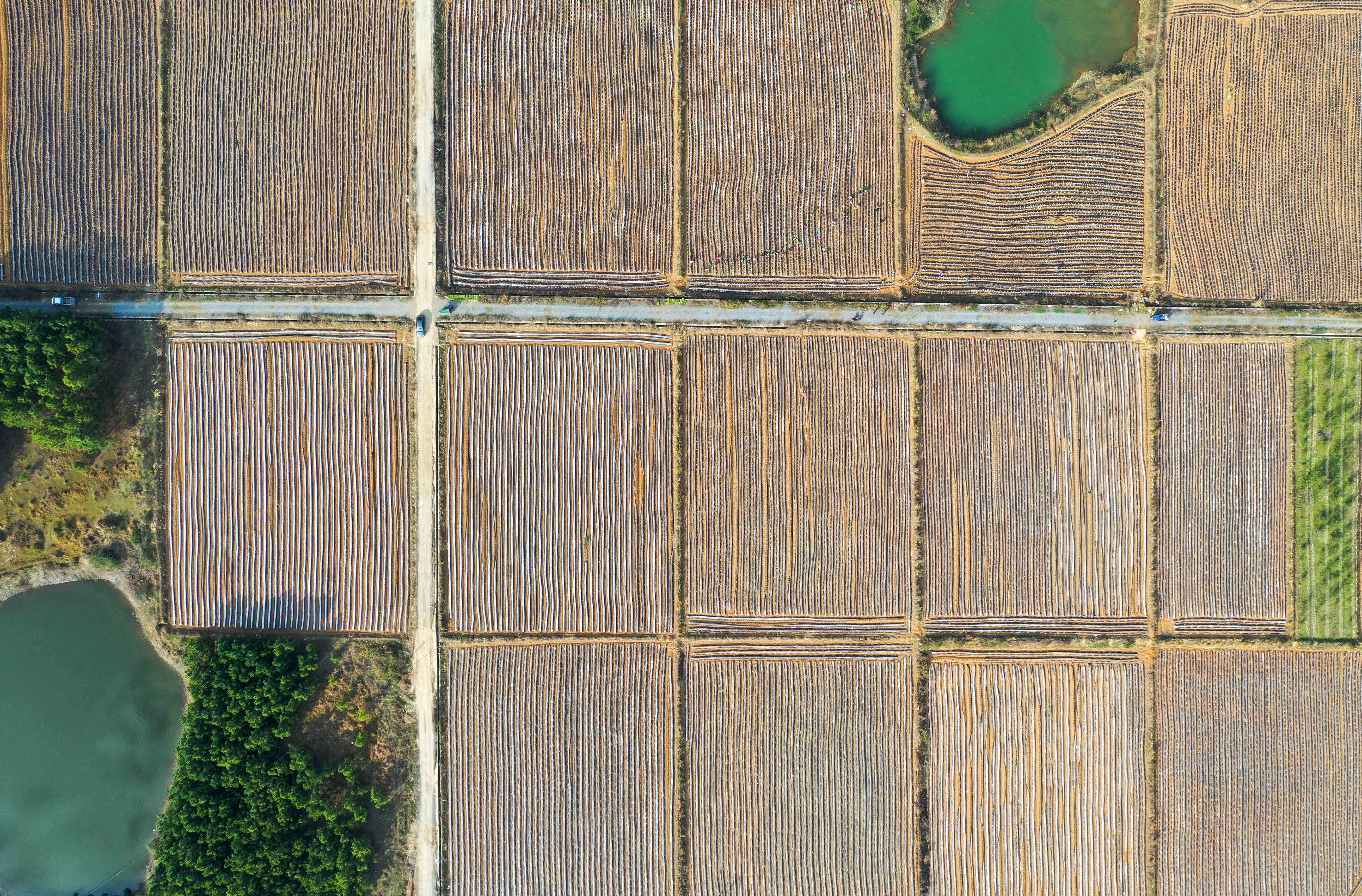 新华社照片,永州(湖南),2022年3月10日 春日农忙 3月9日,在湖南省永州市道县清塘镇,农民在田间移栽春苗(无人机照片)。 随着天气转暖,各地农民抢抓农时开展春耕生产,乡村田野里一派农忙景象。 新华社发(蒋克青 摄)