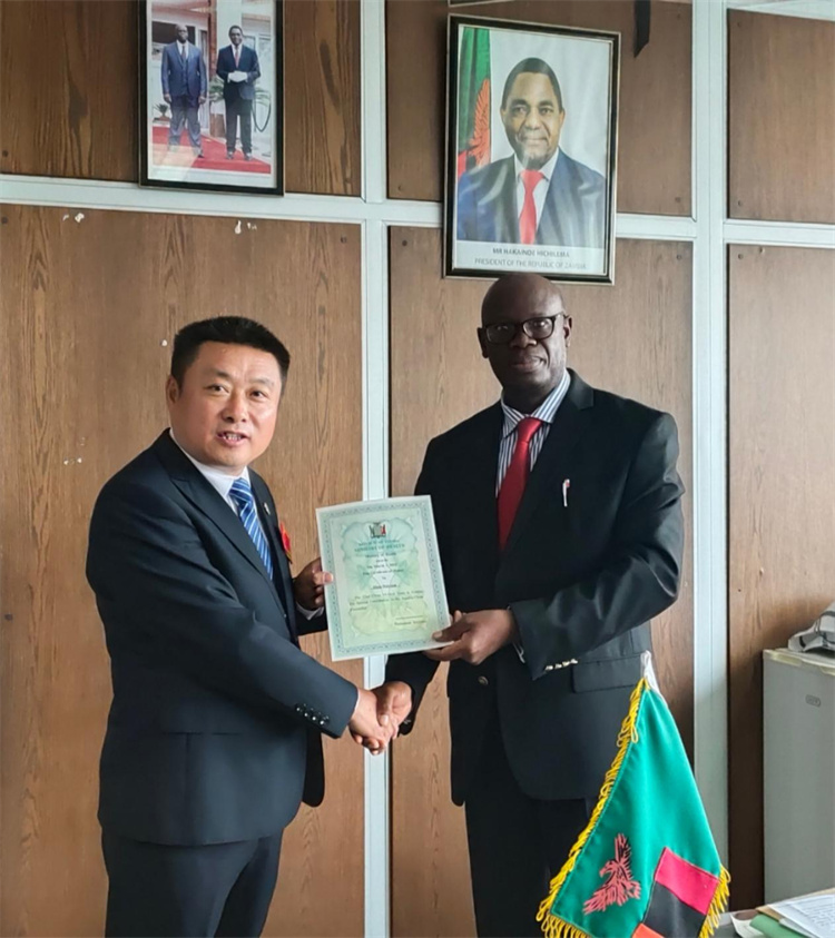 此外,为感谢中国援赞比亚第22批医疗队队长赵海源为赞比亚国家医疗卫生工作和新冠肺炎疫情防治工作所做出的杰出贡献,赞比亚卫生部授予赵海源“赞中友谊特别贡献奖”(Special Contribution to Zambia-China Friendship),卡松卡同时向赵海源颁发该项荣誉证书。