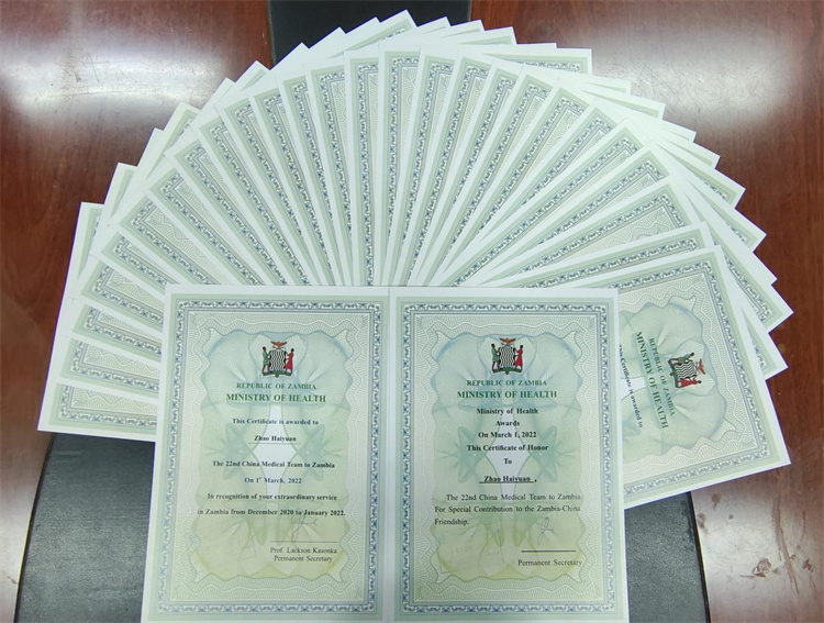 | 荣誉证书。中国援赞比亚第22批医疗队供图 |