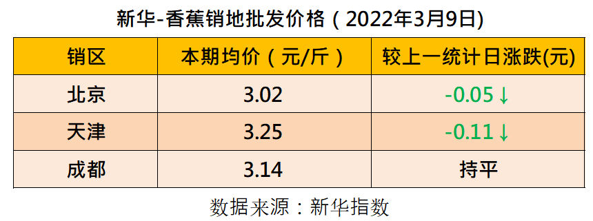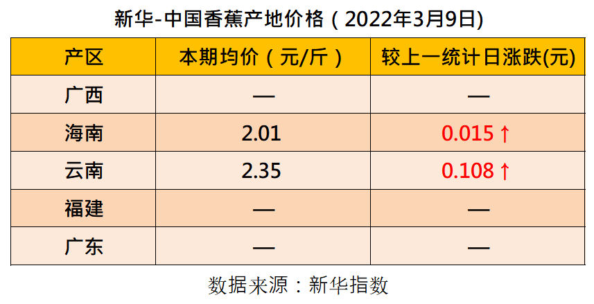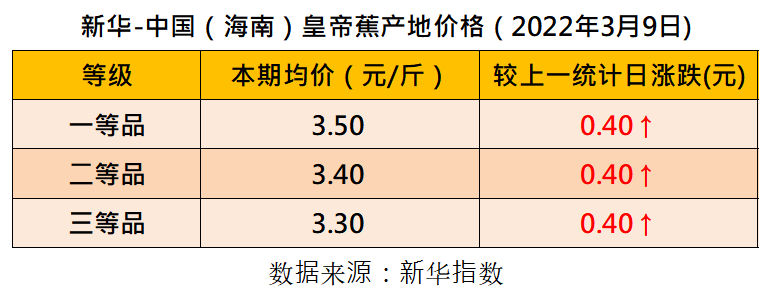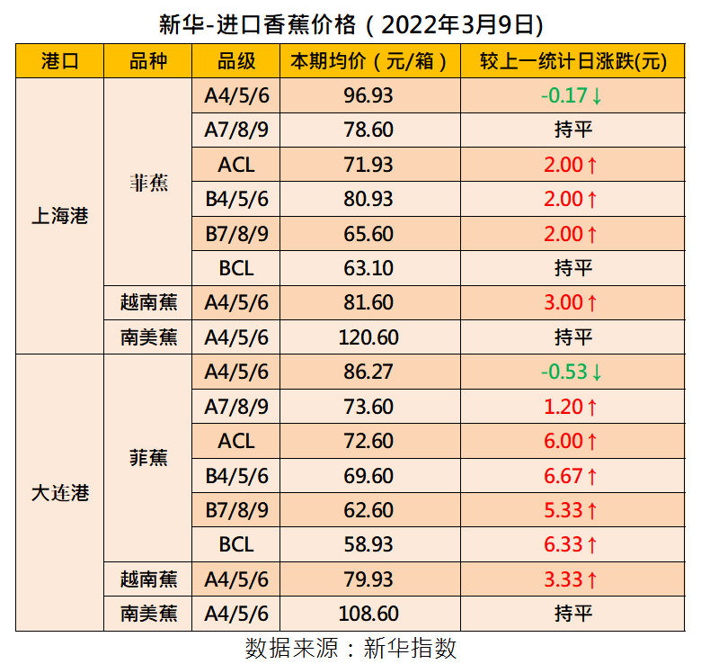 新华指数分析师指出,当前(3月3日-3月9日,下同)全国主要产区香蕉供应量总体有限,好货紧俏,边境口岸受疫情影响香蕉走货受阻,产区蕉价行情持续上涨;销地批发市场走货整体较为平稳,产区供货价格上涨带动销区蕉价高位震荡;进口蕉方面,受国产蕉行情影响,进口香蕉价格止跌转涨;皇帝蕉方面,随着温度回升产区皇帝蕉品质较好,客商收购意愿较强,产区行情整体上涨。