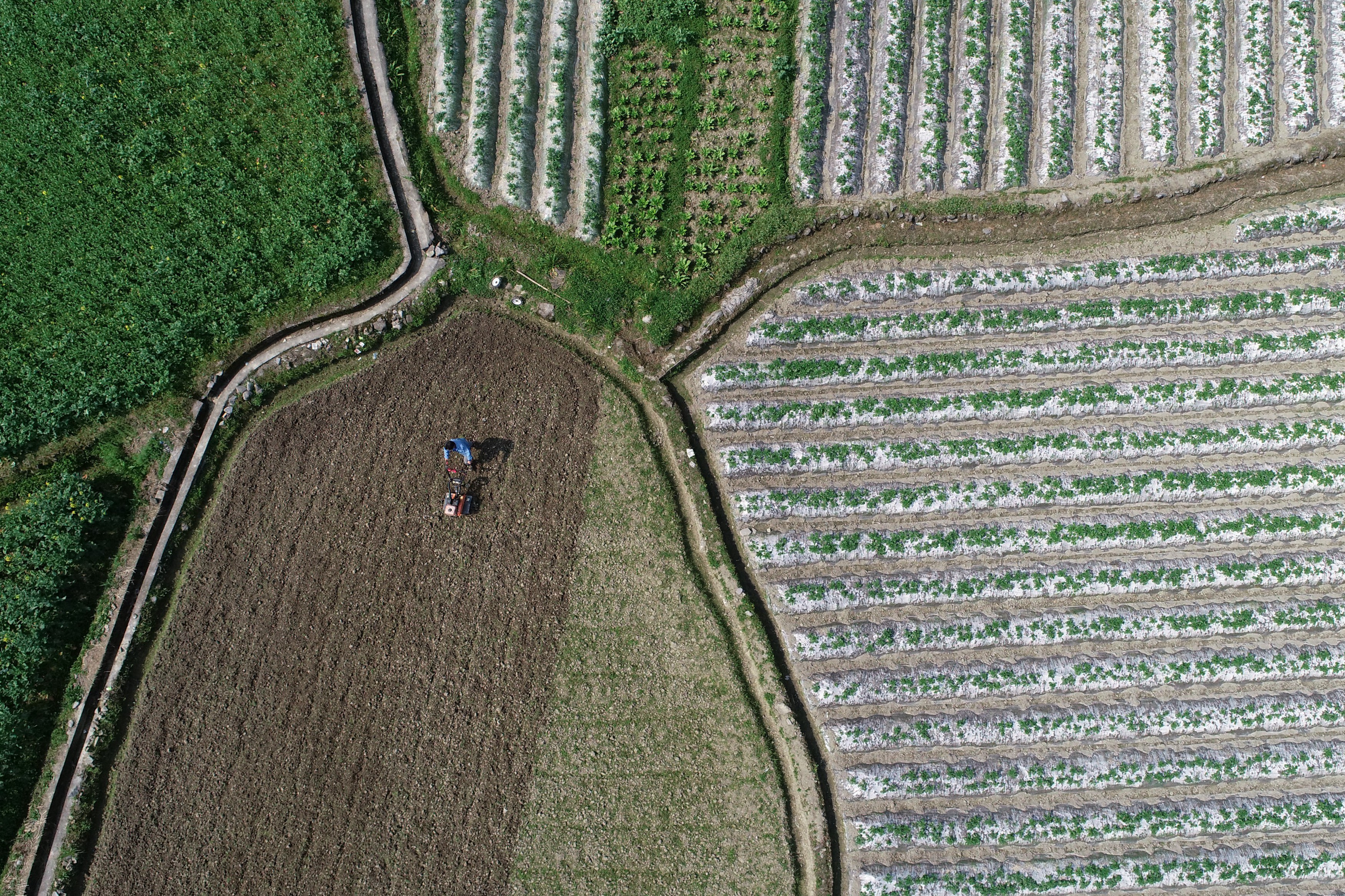 新华社照片,湘西(湖南),2022年3月10日 春日农忙 3月10日,湖南省湘西土家族苗族自治州吉首市乾州街道西门口村的村民在田间劳作(无人机照片)。 随着天气转暖,各地农民抢抓农时开展春耕生产,乡村田野里一派农忙景象。 新华社发(彭彪摄)