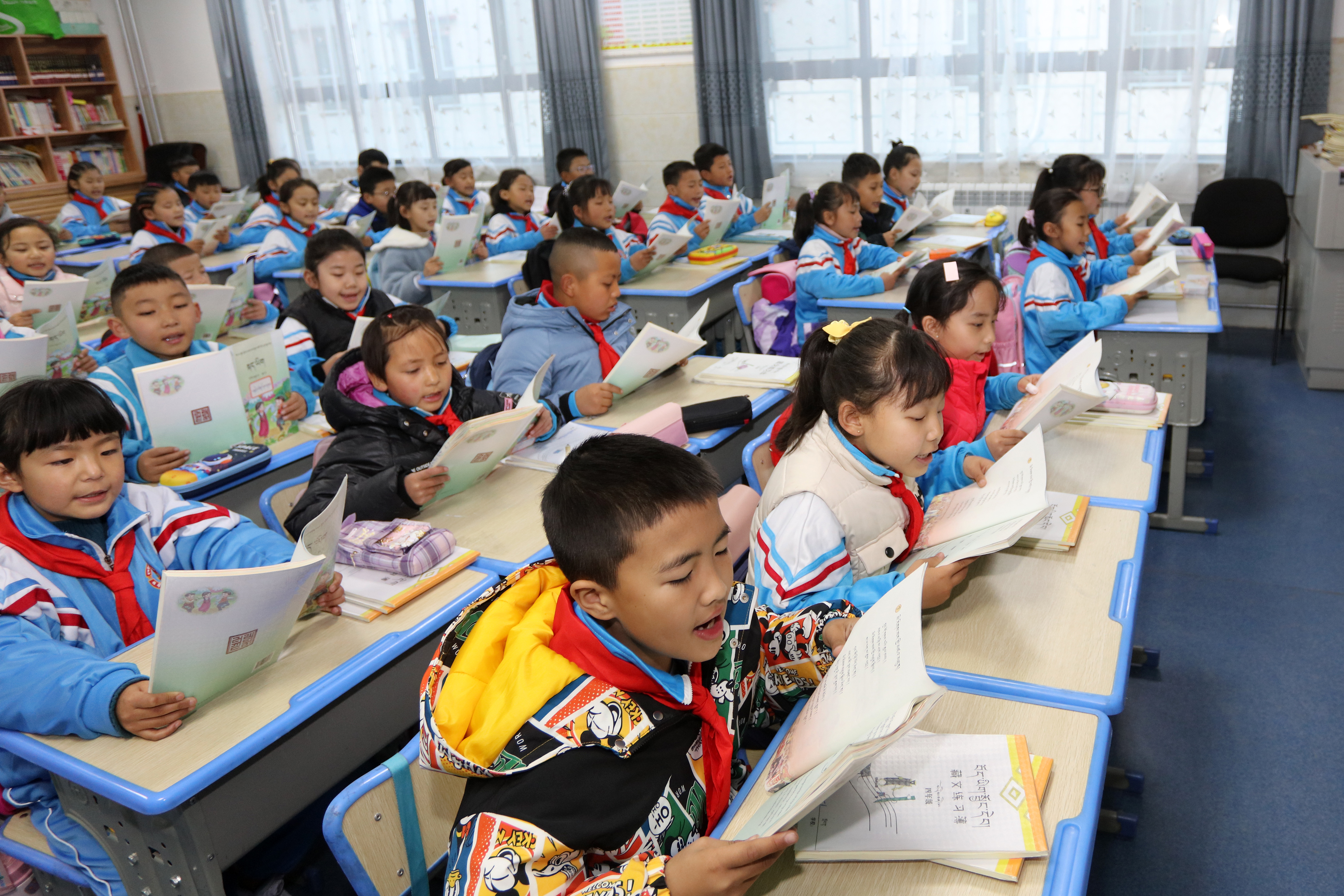 新华社照片,拉萨,2022年3月10日 拉萨市中小学开学 3月10日,拉萨市第一小学学生在课堂上朗读。 当日,拉萨市中小学开学。 新华社记者 姜帆 摄