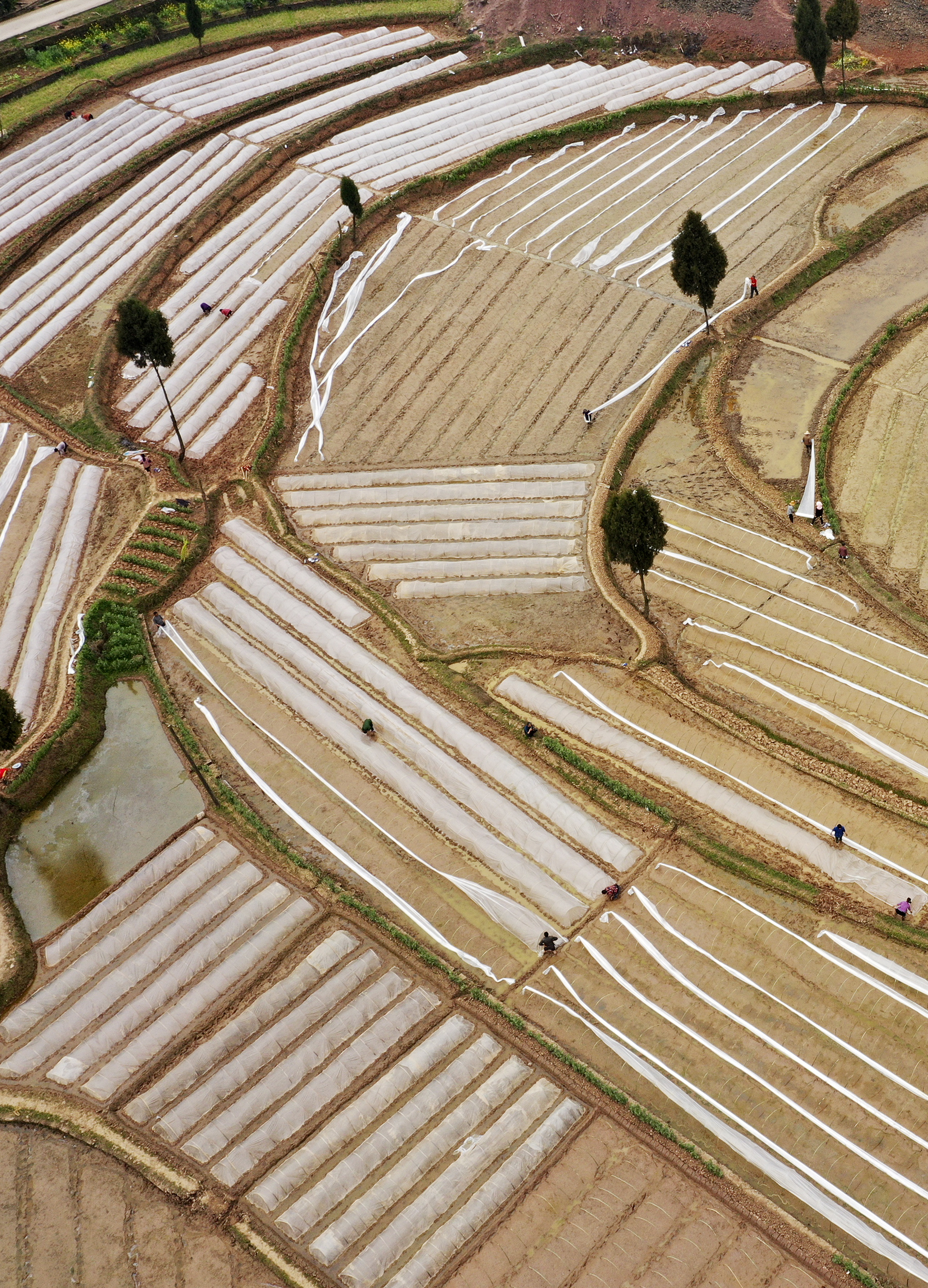 新华社照片,广安(四川),2022年3月10日 春日农忙 3月10日,四川省广安市前锋区观塘镇仁和村村民在覆盖农膜(无人机照片)。 随着天气转暖,各地农民抢抓农时开展春耕生产,乡村田野里一派农忙景象。 新华社发(张启富 摄)