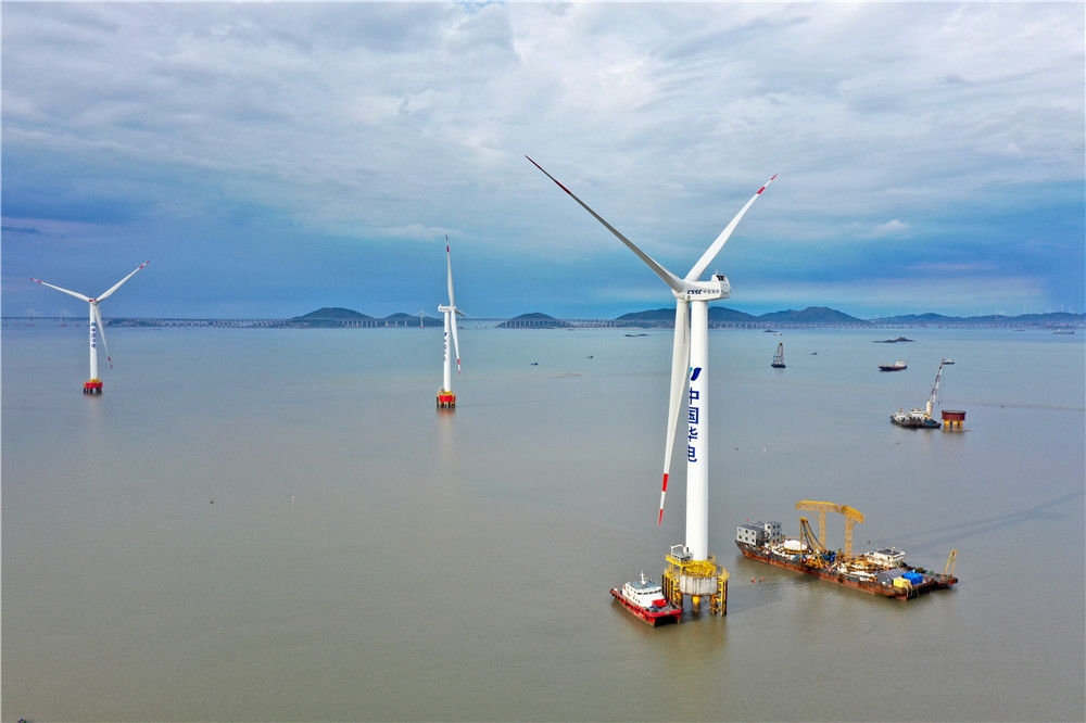 这是华电福清海坛海峡海上风电项目首台海上风电主控系统国产化机组(右)(2021年5月28日摄,无人机照片)。新华社记者 姜克红 摄