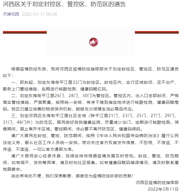 二、划定东海街平江里26门、28门、30门为管控区。管控区内,出入口全部封闭,严格落实管控措施,严禁聚集,按照统一安排,有序下楼到指定地点进行核酸检测,健康码赋橙码。河西区已建立完善的物资保供机制,能够充分保障生活必需品供应。