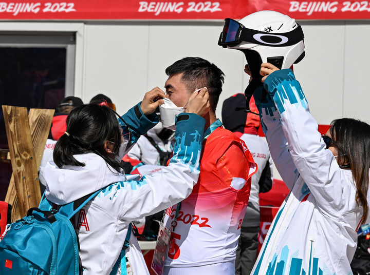 3月6日,中国选手孙艳龙(中)赛后在工作人员的帮助下佩戴口罩。新华社记者孙非摄