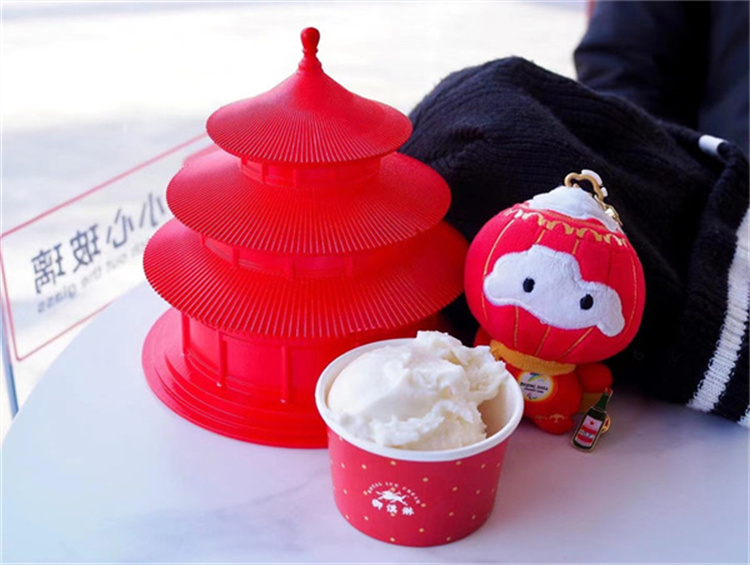 | 《旅行雪容融》天坛·天坛拾光篇。手持二锅头酒瓶(徽章)的雪容融与二锅头口味的冰淇淋。受访者供图 |