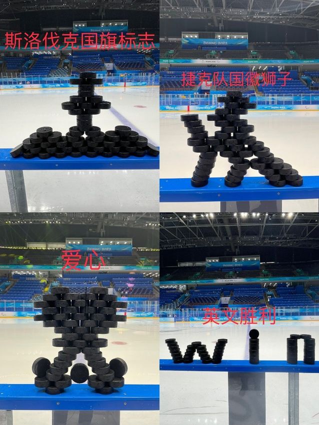 雷鸣说,每一场比赛前,场馆会为两支参赛队伍的冰上热身分别提供50个冰球。然后志愿者会征求队伍的意见,发挥他们的聪明才智和想象力,在板墙上用这些冰球摆放出不同的图案和造型,有的是国家缩写,有的是队伍的吉祥物,有的是某种国家元素,有的是奖杯或者胜利图案,这些都表达了对运动队一种良好的祝愿和温馨的服务。