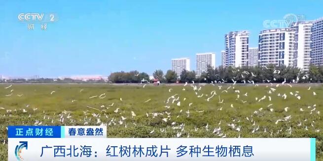 在广西北海金海湾红树林生态旅游区,密密匝匝的红树林群鹜飞天,一派生机盎然的初春景象。百种鸟类、昆虫、贝类、鱼、虾、蟹等生物在此繁衍栖息。近年来,广西北海通过生态修复,生物多样性不断增加,红树林湿地环境和海洋生态系统得到明显改善。目前,湿地公园红树植物共21种。
