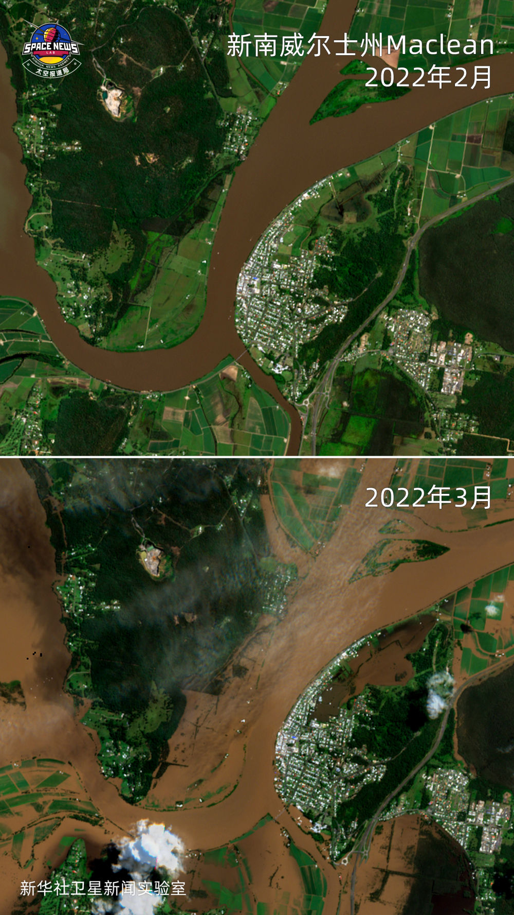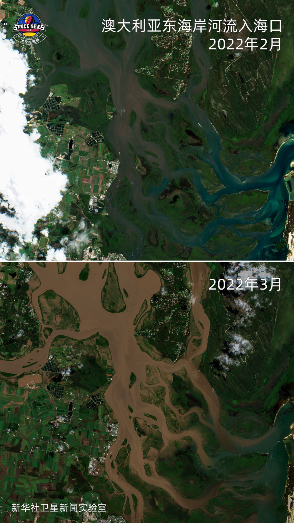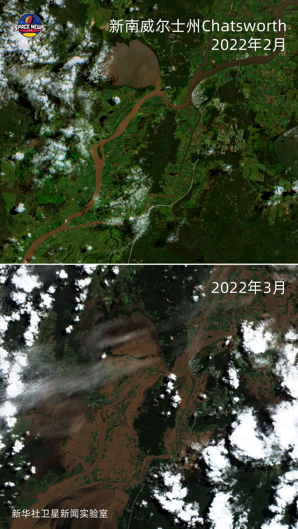 悉尼周边的里士满,受暴雨侵袭,卫星图上,原先的河道难以辨认。