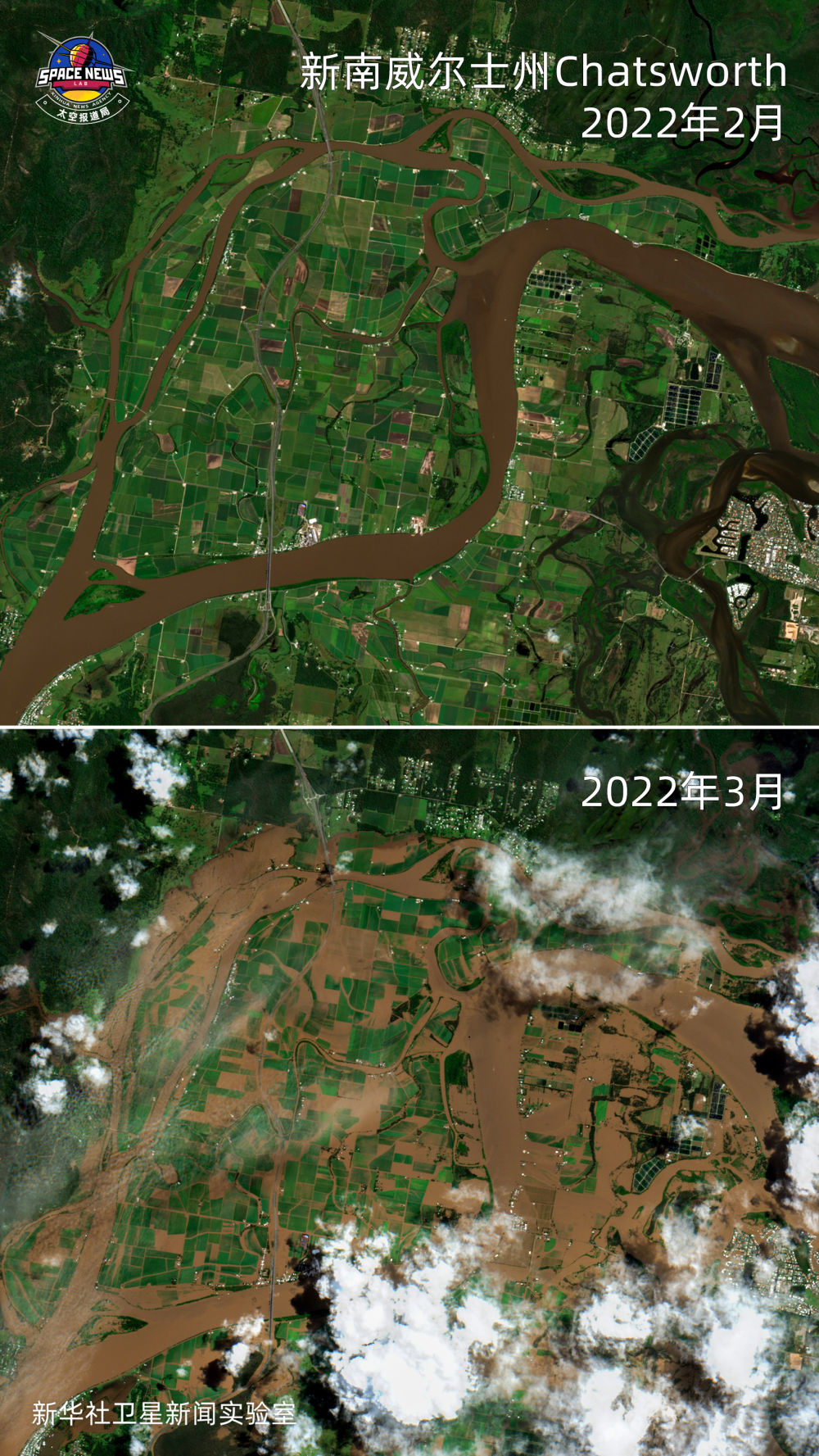 新南威尔士州Chatsworth,强降雨使大量农田被淹,卫星影像观测可见,绿色田地被黄褐色的洪水淹没。