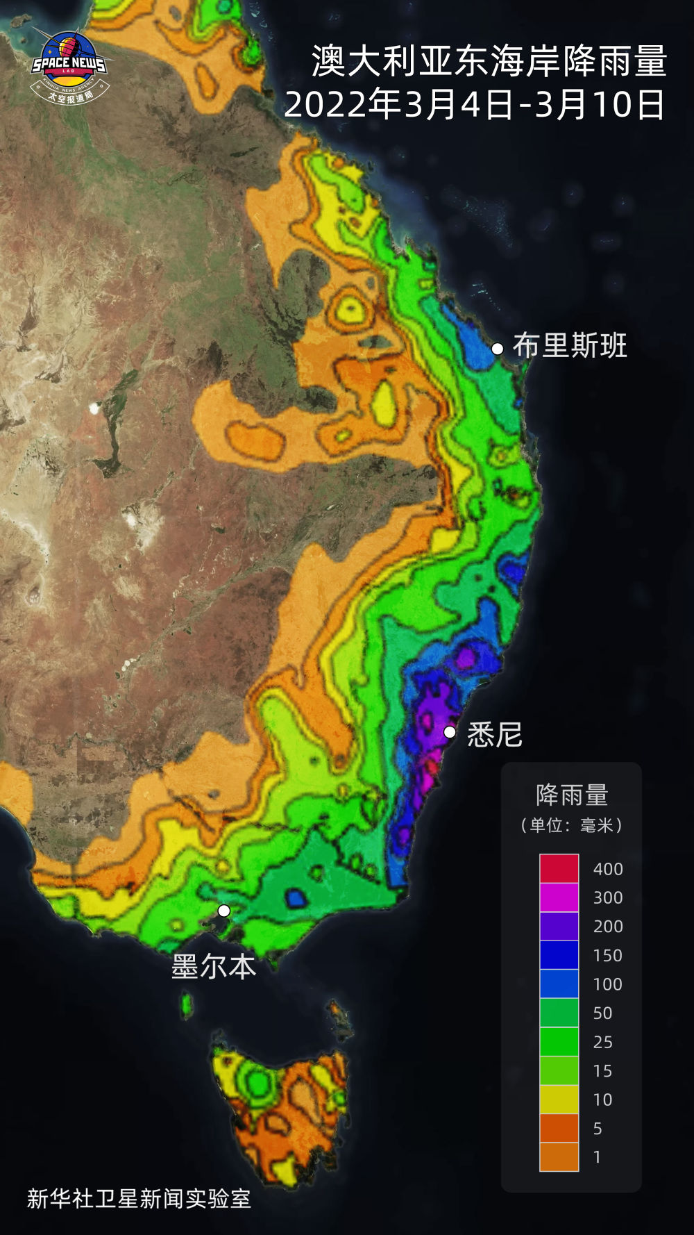 降雨量分布图显示了澳大利亚东部布里斯班、昆士兰和新南威尔士州北部3月4日至10日的降雨量,一些地区超过300mm。