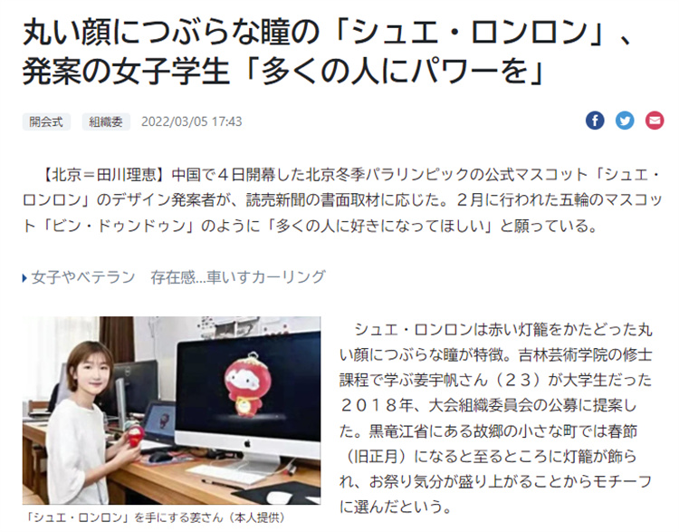“雪容融”诞生背后的故事同样被日本媒体关注,冬残奥会期间《读卖新闻》专访了“雪容融”的设计者之一姜宇帆。这位吉林艺术学院产品设计专业的学生细致讲述了“雪容融”中包含的中国传统元素和设计文化底蕴,希望“雪容融”能够在冬残奥会过程中与冬奥会吉祥物“冰墩墩”一样,向世界传递勇气。