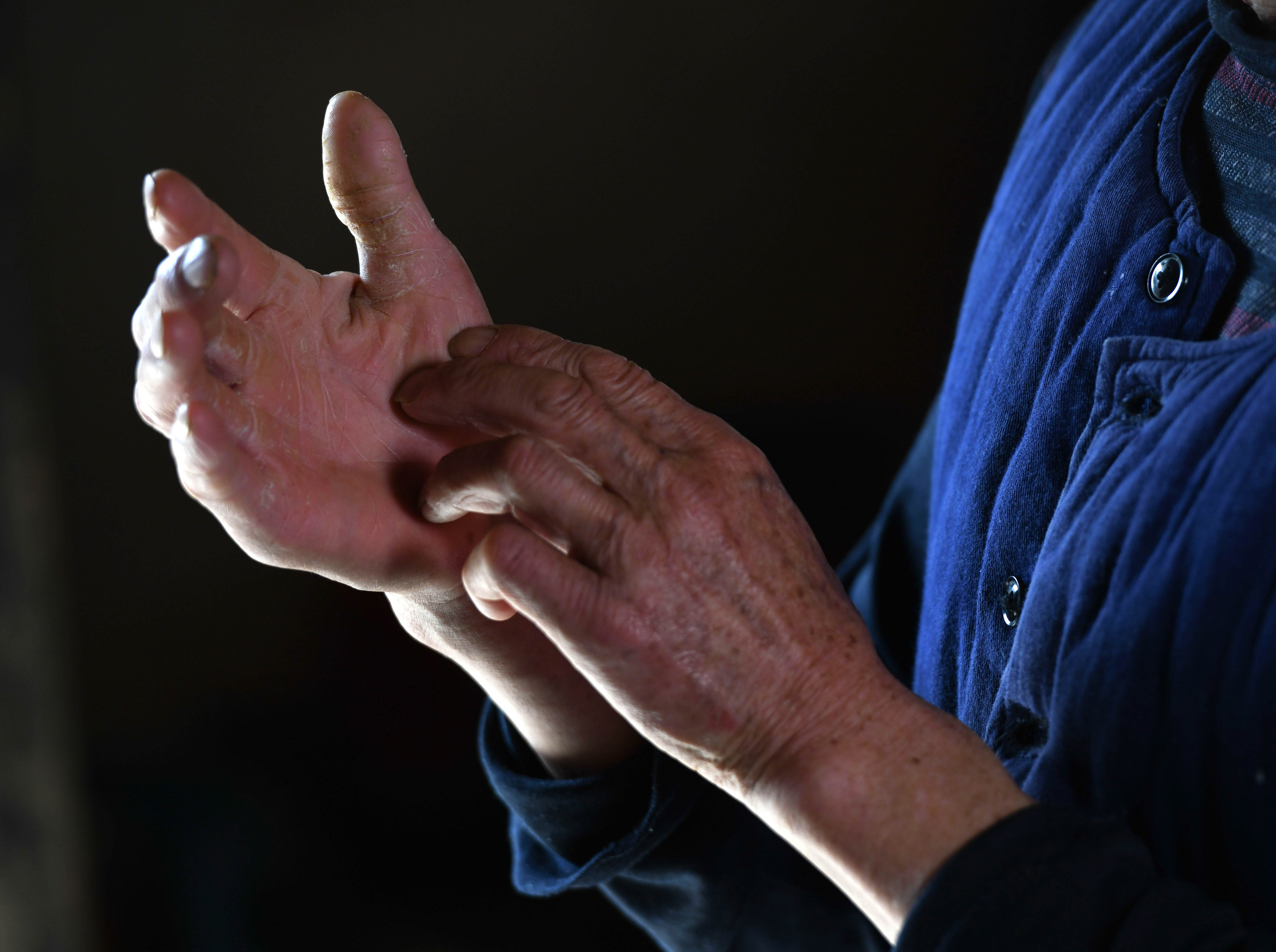 新华社照片,合肥,2022年3月11日 厚厚的掌心绿了荒山 长年植树,易厚掌手上布满老茧和裂痕(3月10日摄)。 位于安徽省含山县陶厂镇的西塔山曾是一座荒山,如今放眼望去,绿色山林与蓝天相映,形成美丽的生态画卷。这幅画卷的“描绘者”,是一位年逾古稀的老人,他叫易厚掌。 今年75岁的易厚掌是含山县陶厂镇西塔村村民。1985年,他与当地林业部门签下承包荒山造林的合同,带着家人开始栽树。30多年来,易厚掌全身心投入到植树造林事业,绿化荒山2000多亩,让曾经荒凉的西塔山充满生机,先后获得全国劳动模范、“中国好人”等荣誉。 易厚掌有个外号叫“大老锤”,在当地的意思是指有决心和耐心的人。他说,植树护林这件事,自己会一直坚持。易厚掌与山林为伴的光阴故事,刻在每一棵树的年轮里,也写在他厚厚的掌心上。 新华社记者 张端 摄