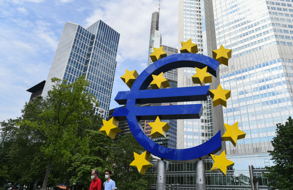 2021年6月28日,人们从位于德国法兰克福的欧元雕塑前走过。新华社记者逯阳摄