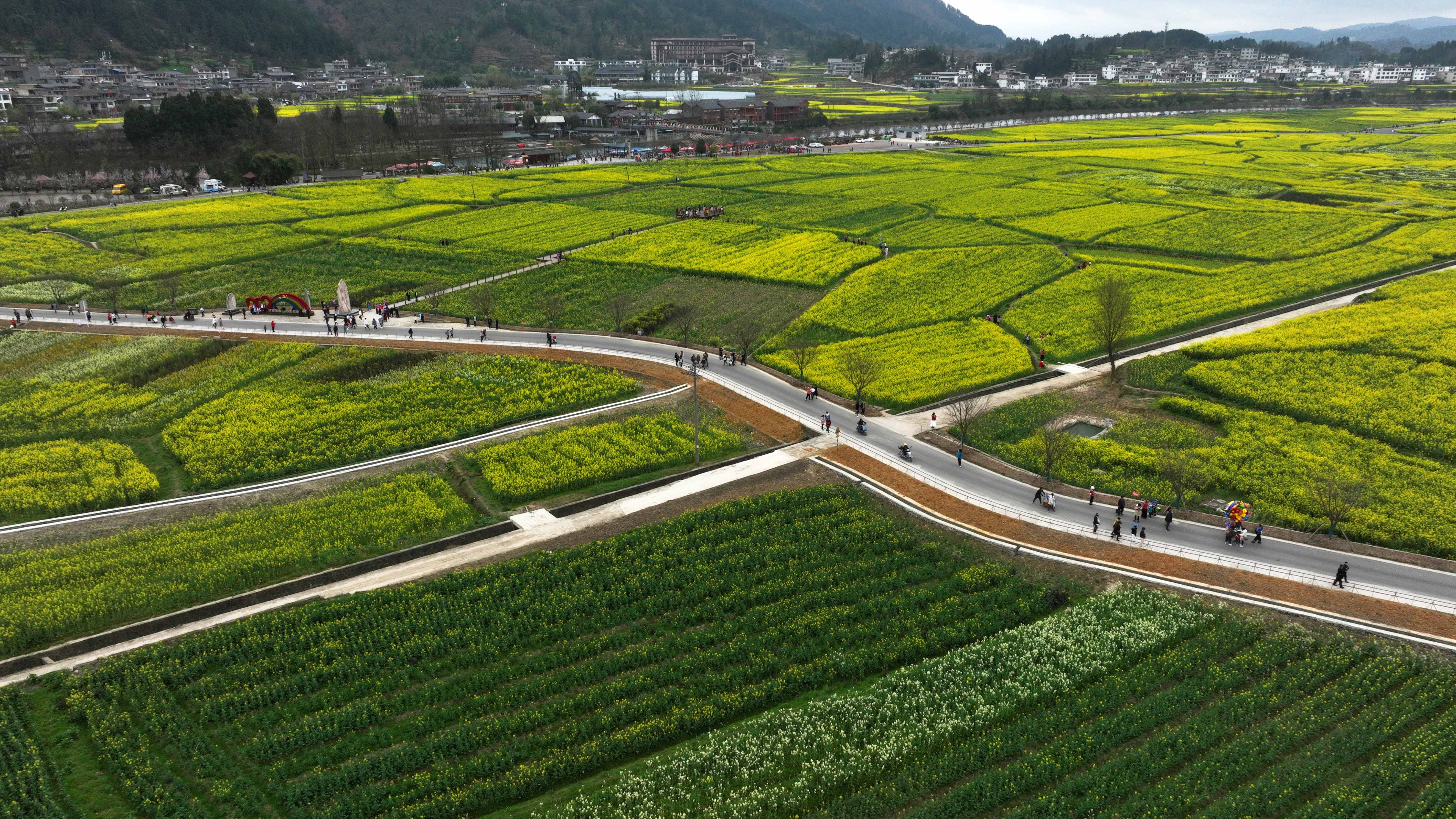 新华社照片,贵定(贵州),2022年3月11日 贵州贵定:“赏花经济”带动乡村旅游 3月11日,游客在贵州省贵定县盘江镇“金海雪山”景区观赏油菜花(无人机照片)。 近年来,贵州省黔南布依族苗族自治州贵定县大力推进美丽乡村建设,以村居环境升级改造为主题,打造特色旅游村寨;同时,全县种植油菜9.5万亩,形成以“赏花经济”为特色的农旅结合产业,吸引众多游客前来赏花观光,带动乡村旅游,推进乡村振兴。 新华社记者 杨楹 摄
