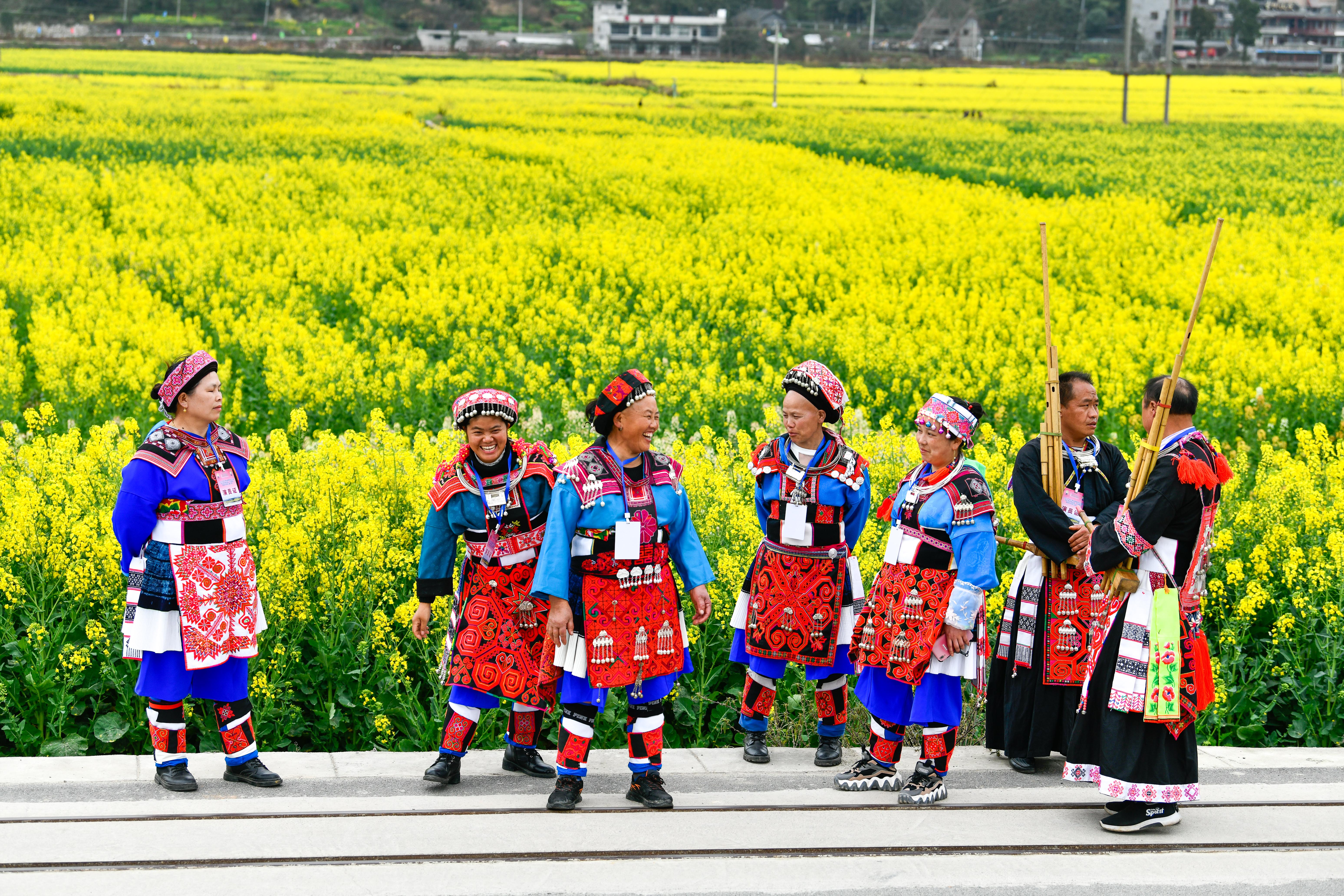 新华社照片,贵定(贵州),2022年3月11日 贵州贵定:“赏花经济”带动乡村旅游 3月11日,在贵州省贵定县盘江镇“金海雪山”景区,身着民族服饰的村民在油菜花田边。 近年来,贵州省黔南布依族苗族自治州贵定县大力推进美丽乡村建设,以村居环境升级改造为主题,打造特色旅游村寨;同时,全县种植油菜9.5万亩,形成以“赏花经济”为特色的农旅结合产业,吸引众多游客前来赏花观光,带动乡村旅游,推进乡村振兴。 新华社记者 杨文斌 摄