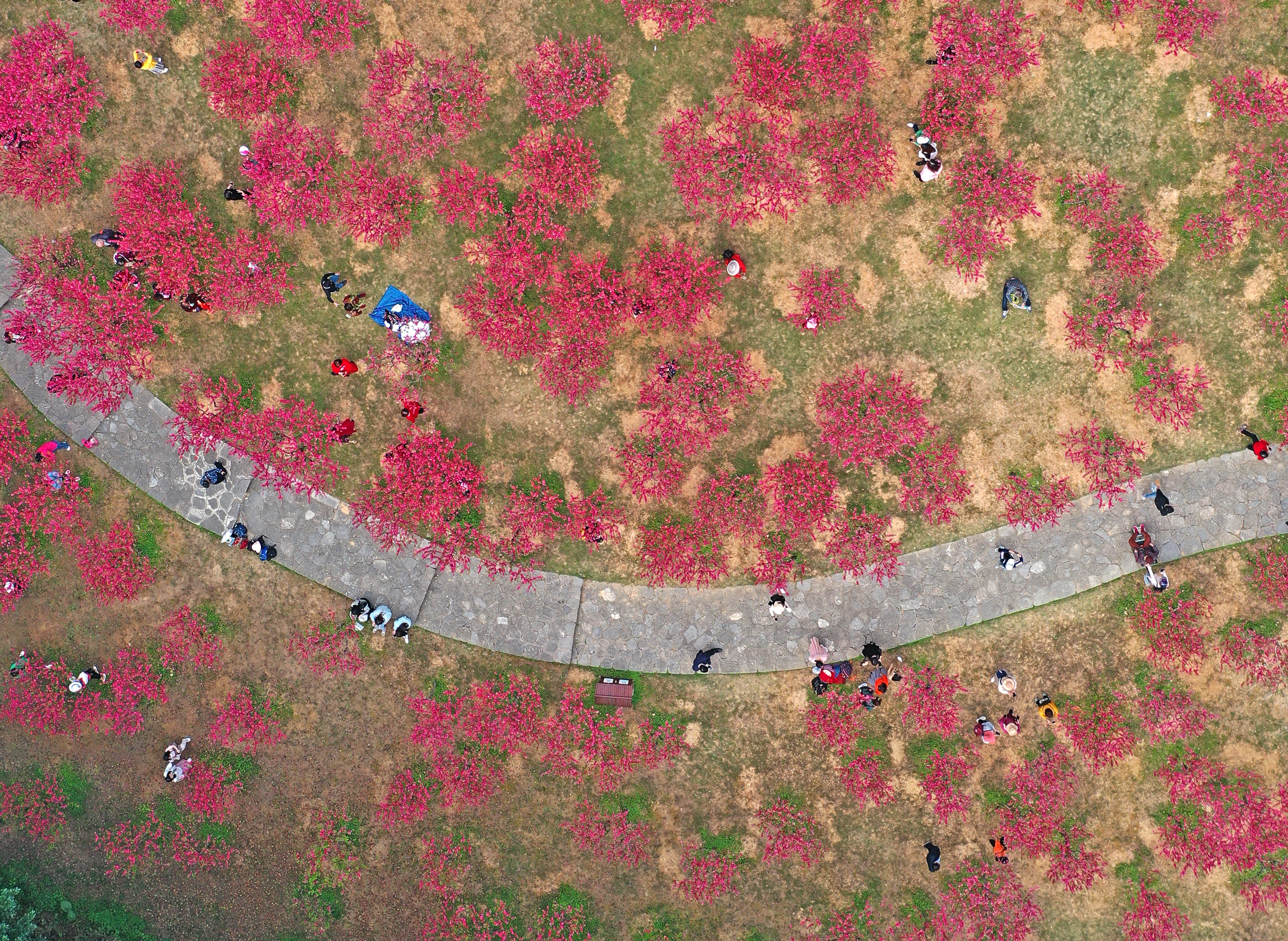 新华社照片,南宁,2022年3月11日 春暖花开醉游人 游客在广西南宁市青秀山风景区观赏桃花(3月11日摄,无人机照片)。 春暖花开时节,人们外出踏春赏花,感受浓浓的春意。 新华社记者 周华 摄