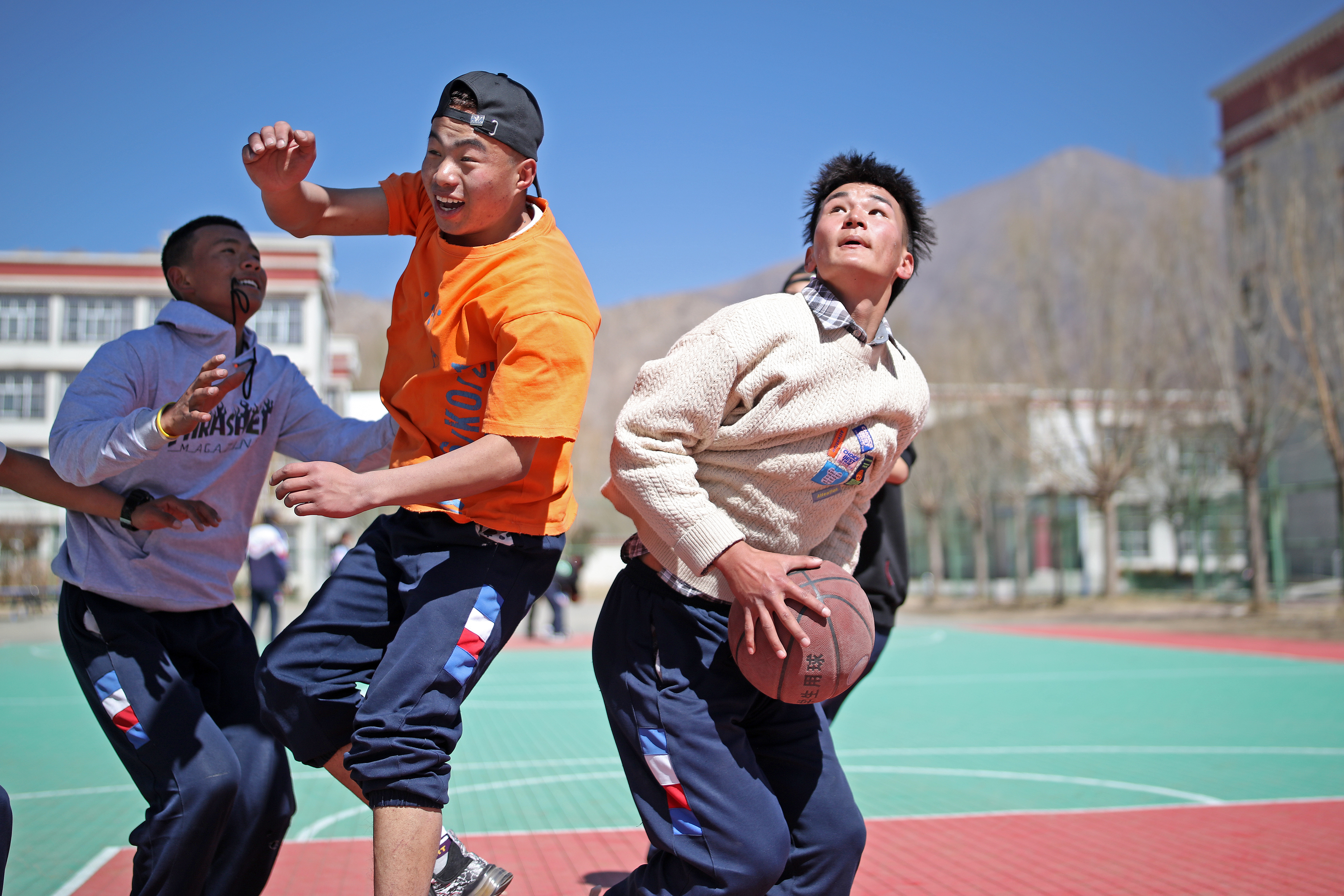 3月10日,拉萨江苏实验中学学生在体育课上打篮球。新华社记者姜帆 摄