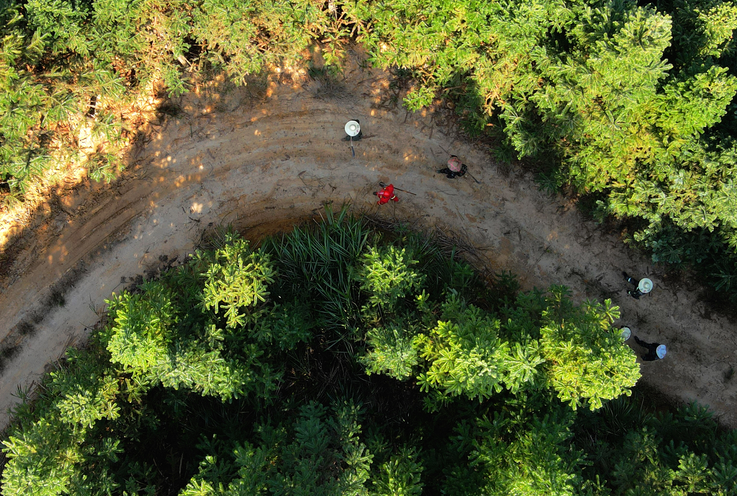 新华社照片,安溪(福建),2022年3月11日 40多年,1万多亩!黄秋水的“绿化情缘” 3月11日,黄秋水和同事走在林区小路上(无人机照片)。 59岁的黄秋水是福建省安溪丰田国有林场的一名普通护林员。1978年,安溪丰田国有林场开始筹建,黄秋水只身一人从县城来到偏远林区,把青春奉献给这片林场。 40多年间,作为守护者和见证者,巡山、植树、救火、管护,黄秋水走遍了林场的每个山头每处地块。他亲手栽植林木面积上万亩,被授予“全国绿化劳动模范”“全国优秀护林员”等荣誉称号。当年亲手种下的树苗,如今已长成大树。“明年我就要退休了,可越临近退休,心中就越放不下这片山林。”黄秋水说。 新华社记者 魏培全 摄