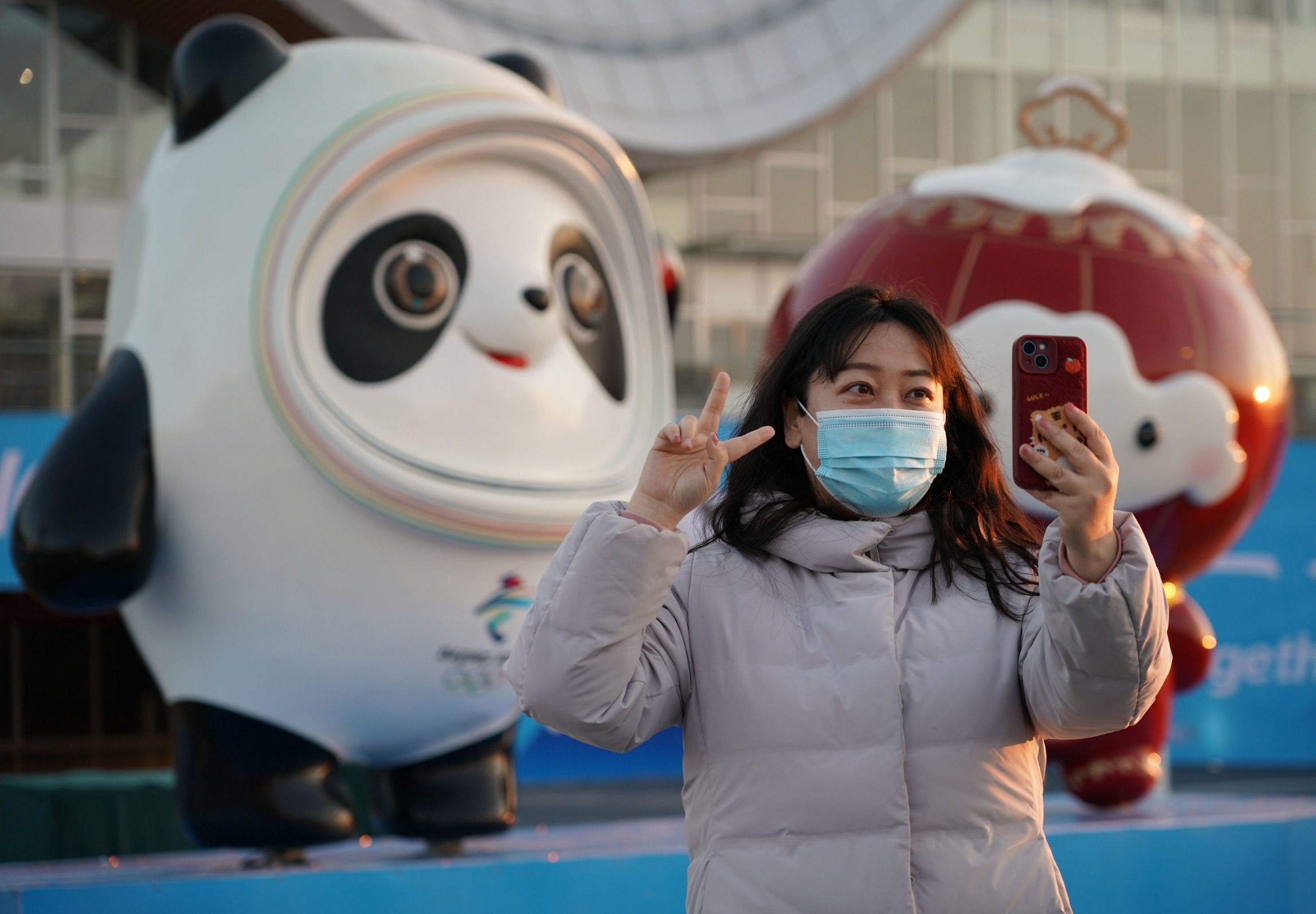 1月29日,一名女士在京张高铁延庆站外的冬奥景观前拍照留念。新华社记者任超摄