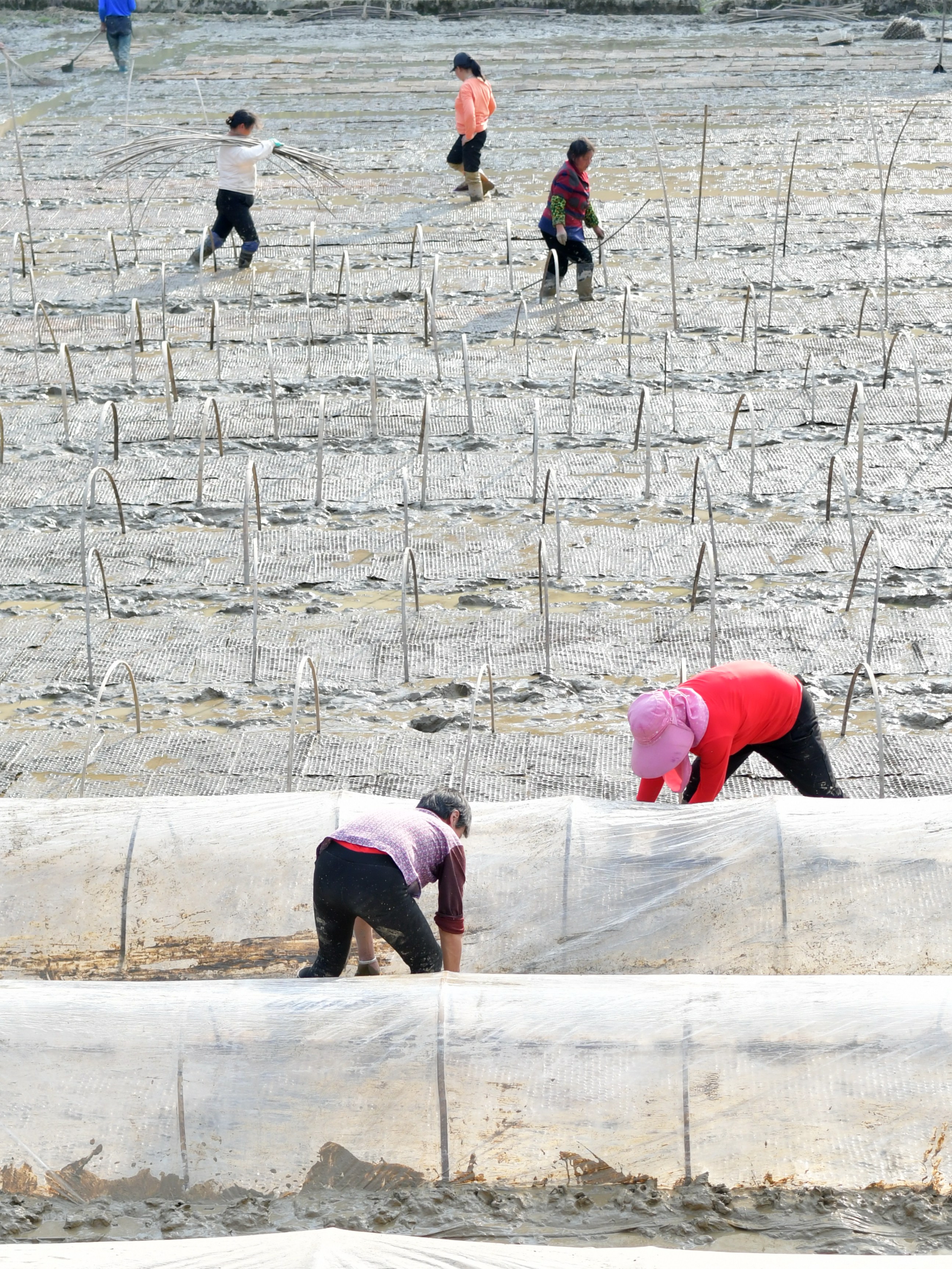 新华社照片,娄底(湖南),2022年3月11日 春光好 农事忙 3月11日,在湖南省娄底市双峰县沙塘乡双红村的早稻集中育秧点,农民在秧田劳作。 春暖时节,神州大地春耕备耕如火如荼,乡村田野一派农忙景象。 新华社发(李建新摄)