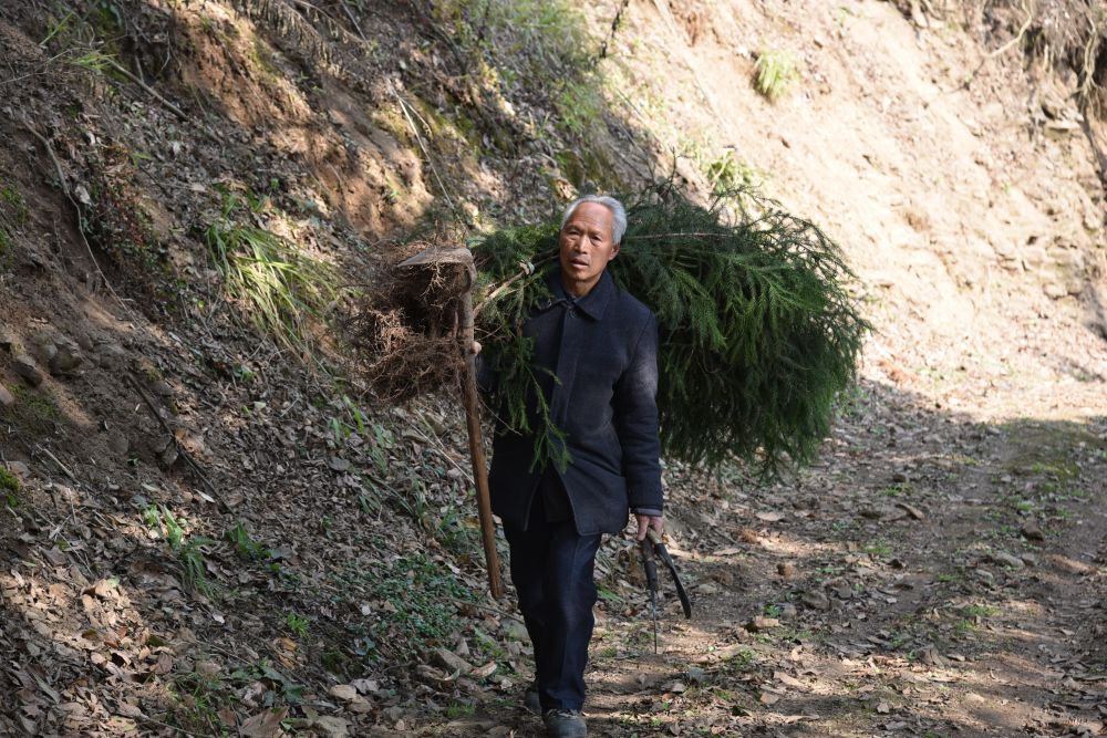 初春,王华文背着树苗上山种树。 新华社记者 李凡 摄
