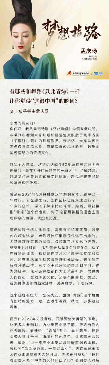#梦想指路#【这,很中国!】中国传统文化的魅力深入人心,中国式浪漫频频刷屏。还记得虎年春晚上脱胎于北宋名画《千里江山图》的舞蹈《只此青绿》吗?@新华社 邀请到了青年舞者@孟庆旸 分享她与“青绿”的故事,戳图了解↓↓↓来评论区一起聊聊,#哪些瞬间让你觉得这很中国#?