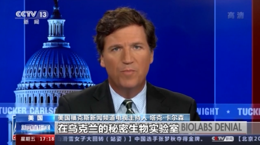 美国福克斯新闻频道电视主持人塔克·卡尔森:昨天我们报道了,美国政府资助了在乌克兰的秘密生物实验室进行危险的病原体研究。我们以为这不是真的,这太夸张了,太奇怪了。美国政府也多次强烈否认,并称这是俄罗斯的宣传工具,我们愚蠢地认为美国政府说的是真的,但美国政府负责乌克兰问题的官员确认美国资助乌克兰生物实验室的说法是真的。