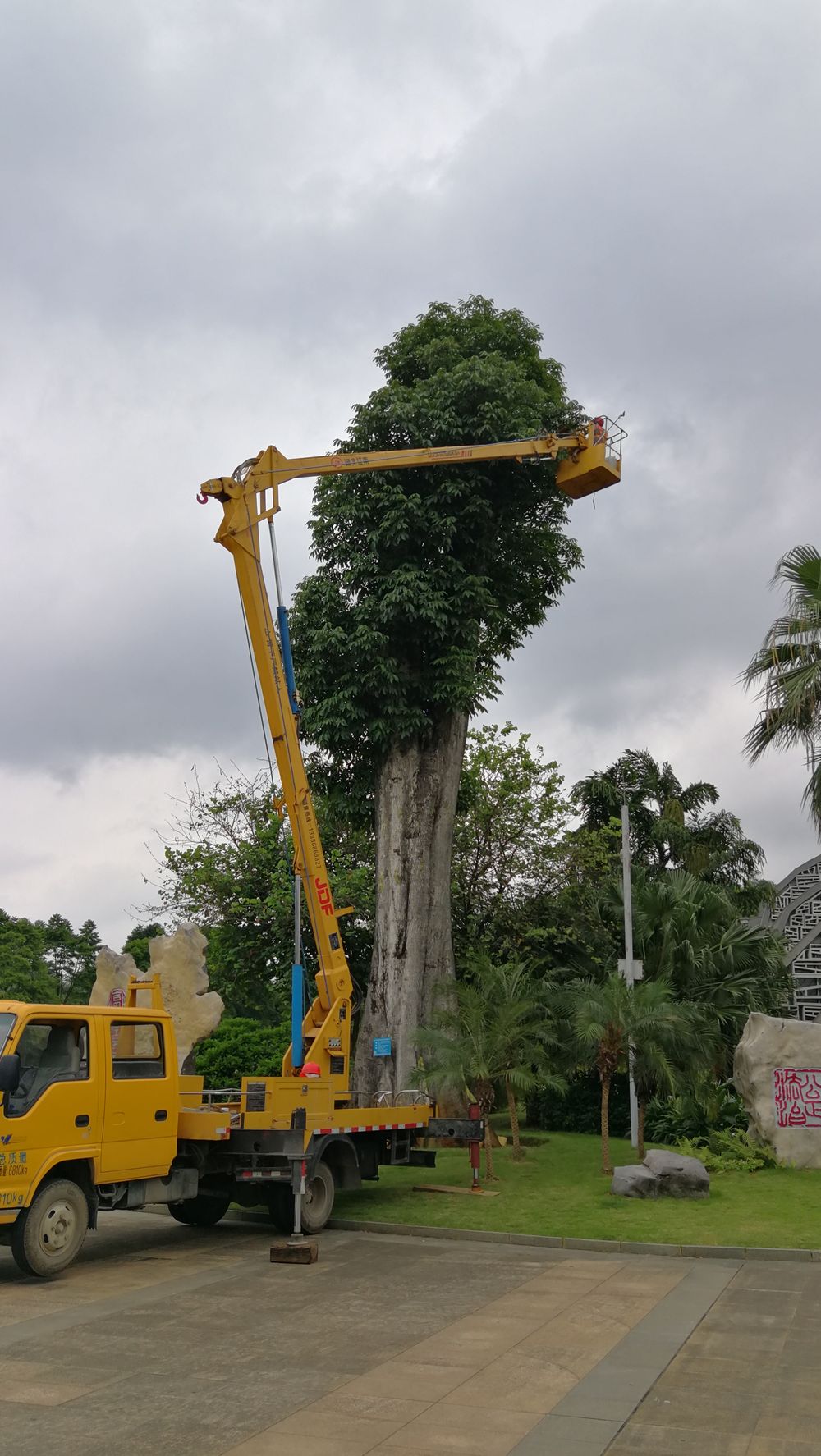 工作人员搭乘升降车,观察“树王”长势。(柳州市林业和园林局供图)