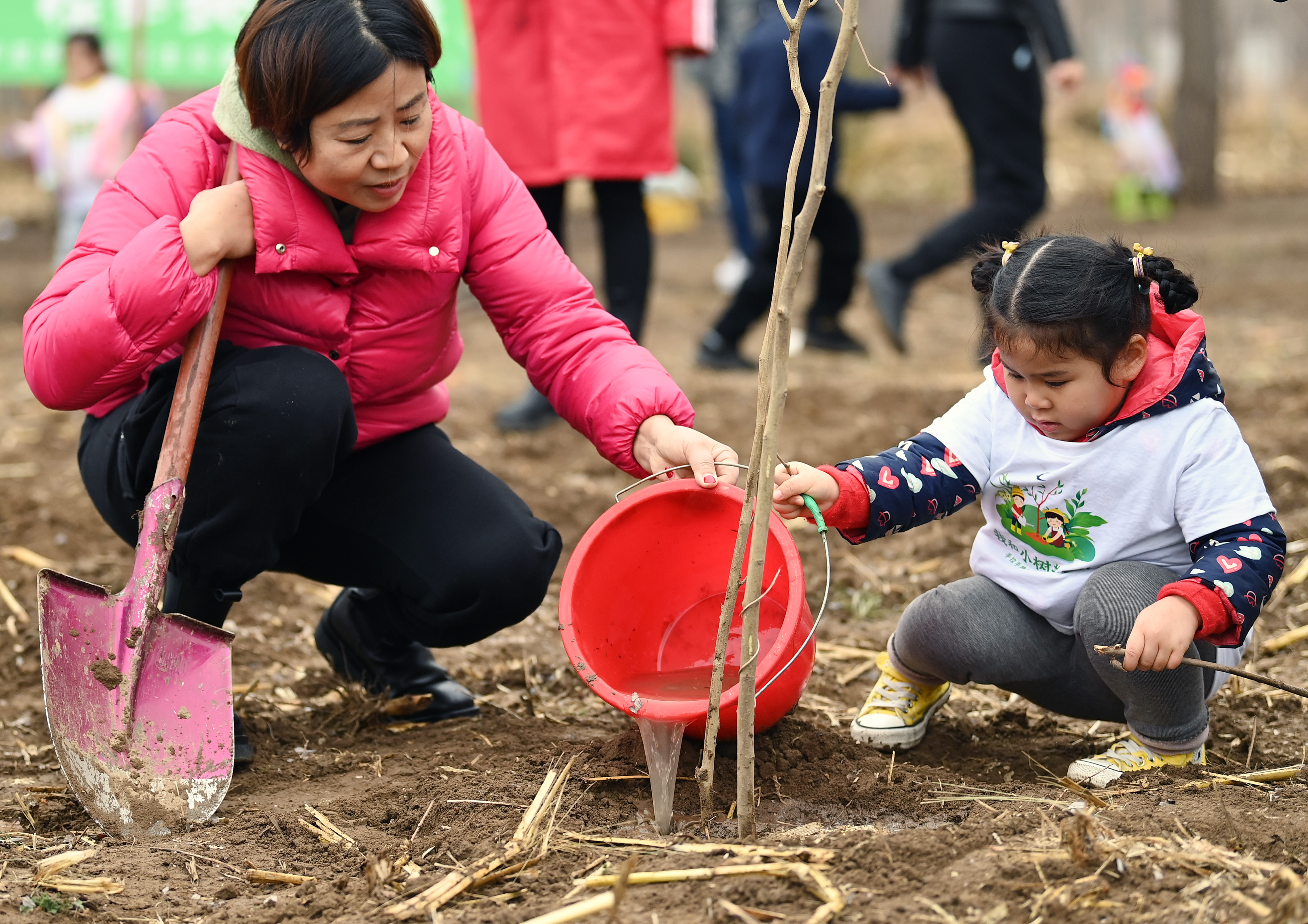 新华社照片,北京,2022年3月12日 “我和小树共成长” 3月12日,小朋友在家人的陪伴下为树苗浇水。 当日是植树节,“我和小树共成长”手拉手公益植树活动在北京第五季龙水凤港生态农场举行。小朋友在家人的陪伴下参加植树,以实际行动践行保护环境、维护生物多样性的理念。 新华社记者 李贺 摄
