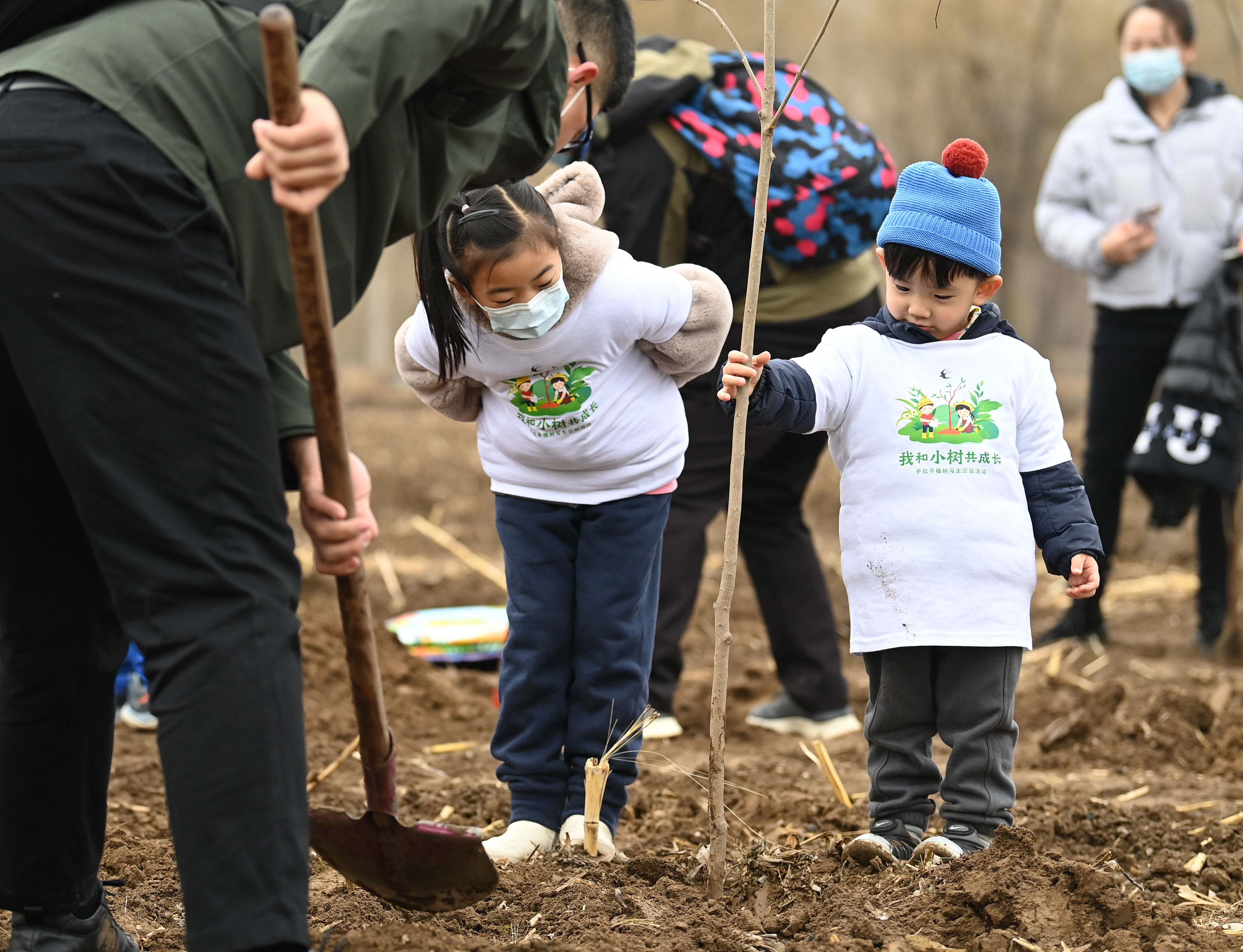 新华社照片,北京,2022年3月12日 “我和小树共成长” 3月12日,小朋友在家人的陪伴下植树。 当日是植树节,“我和小树共成长”手拉手公益植树活动在北京第五季龙水凤港生态农场举行。小朋友在家人的陪伴下参加植树,以实际行动践行保护环境、维护生物多样性的理念。 新华社记者 李贺 摄