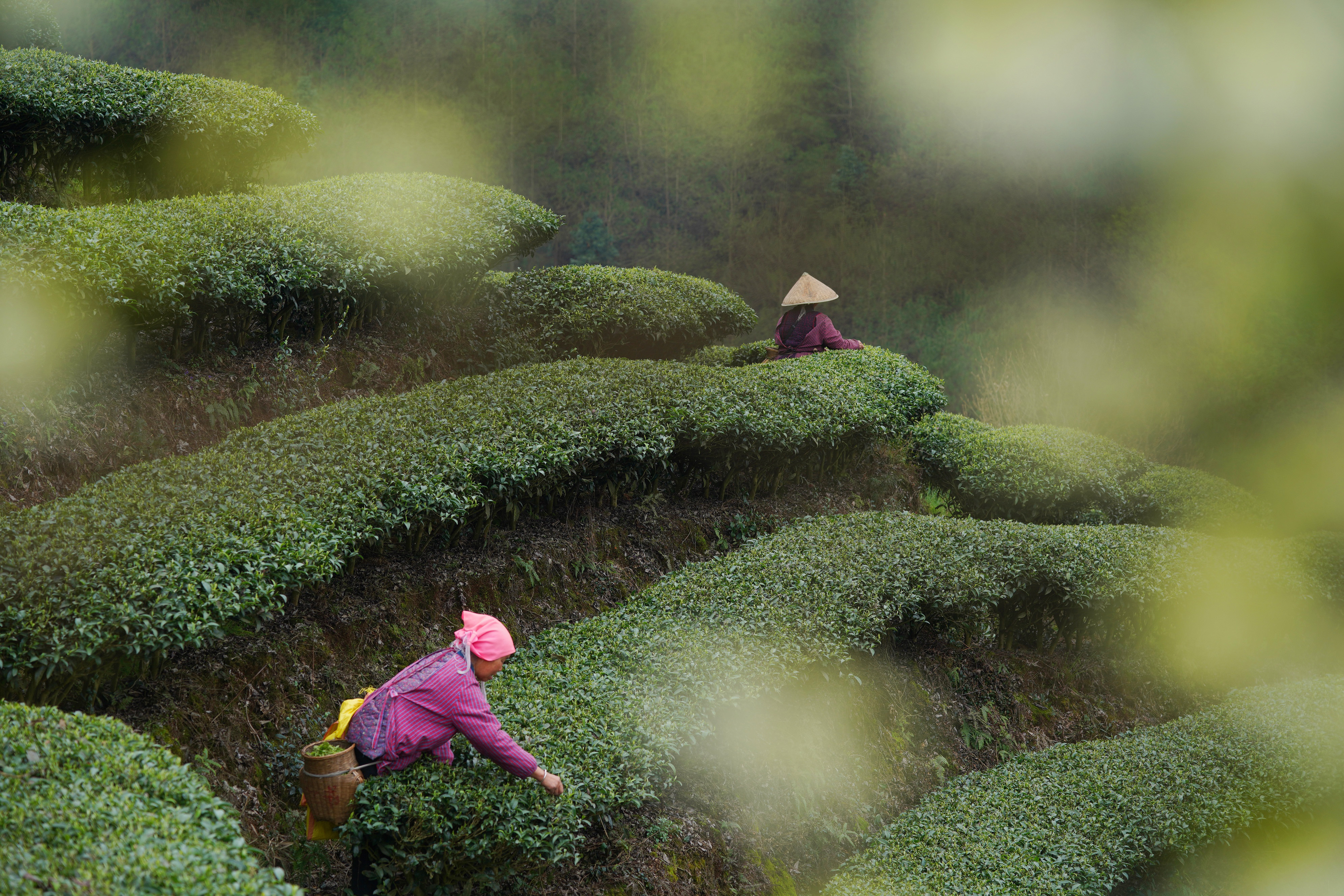 新华社照片,怀化(湖南),2022年3月12日 茶园春意浓 3月12日,湖南省怀化市通道侗族自治县菁芜洲镇地连村,茶农在采茶。 气温转暖,茶园吐绿,嫩芽争春,多地进入春茶采摘期。 新华社发(吴三东摄)