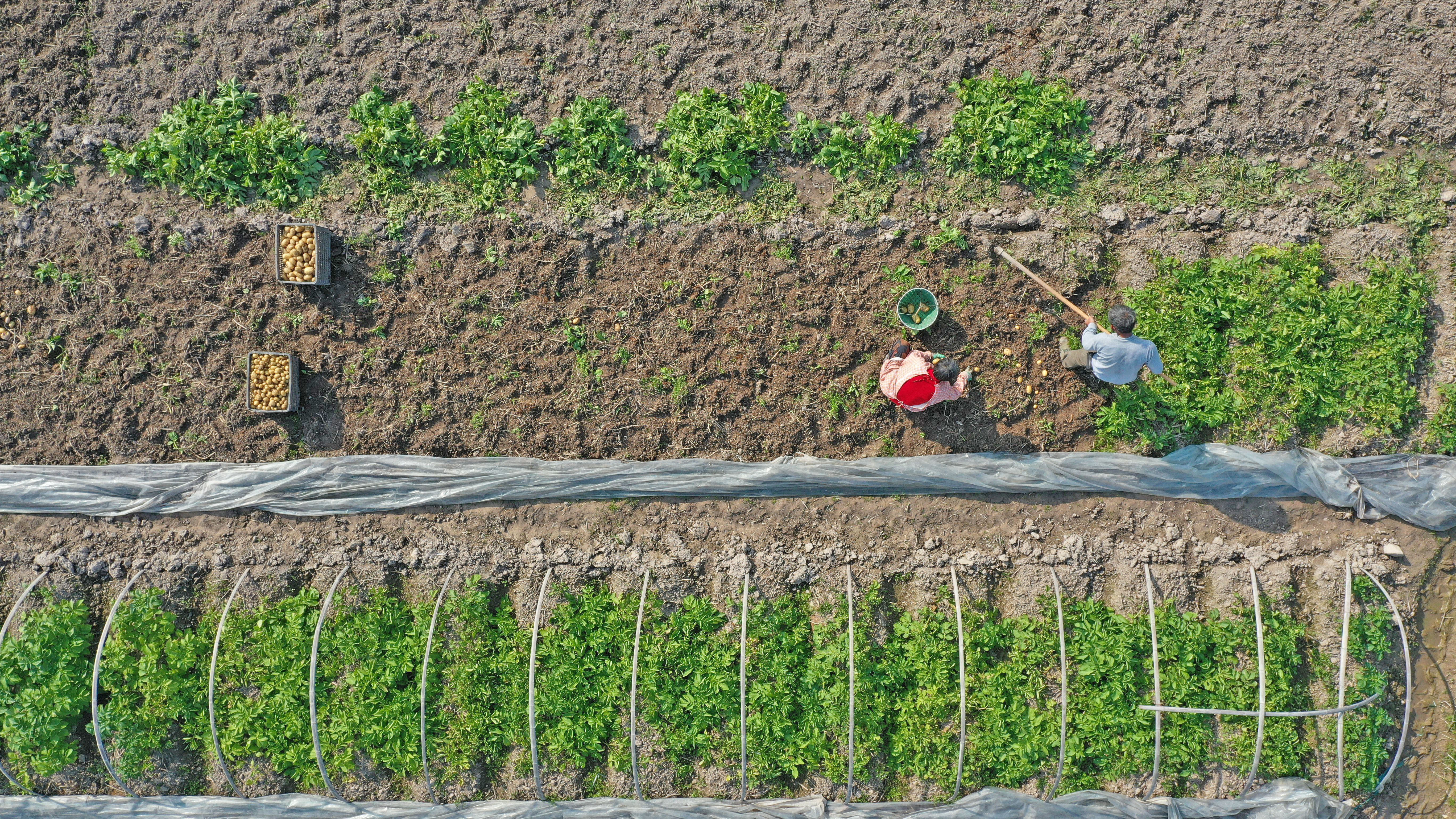 新华社照片,仙居(浙江),2022年3月12日 春暖农事忙 3月12日,浙江省台州市仙居县下各镇农民正在田间采收土豆(无人机照片)。 随着天气回暖,各地农民抢抓时机进行春耕生产,大江南北呈现春日农忙画卷。 新华社发(王华斌摄)