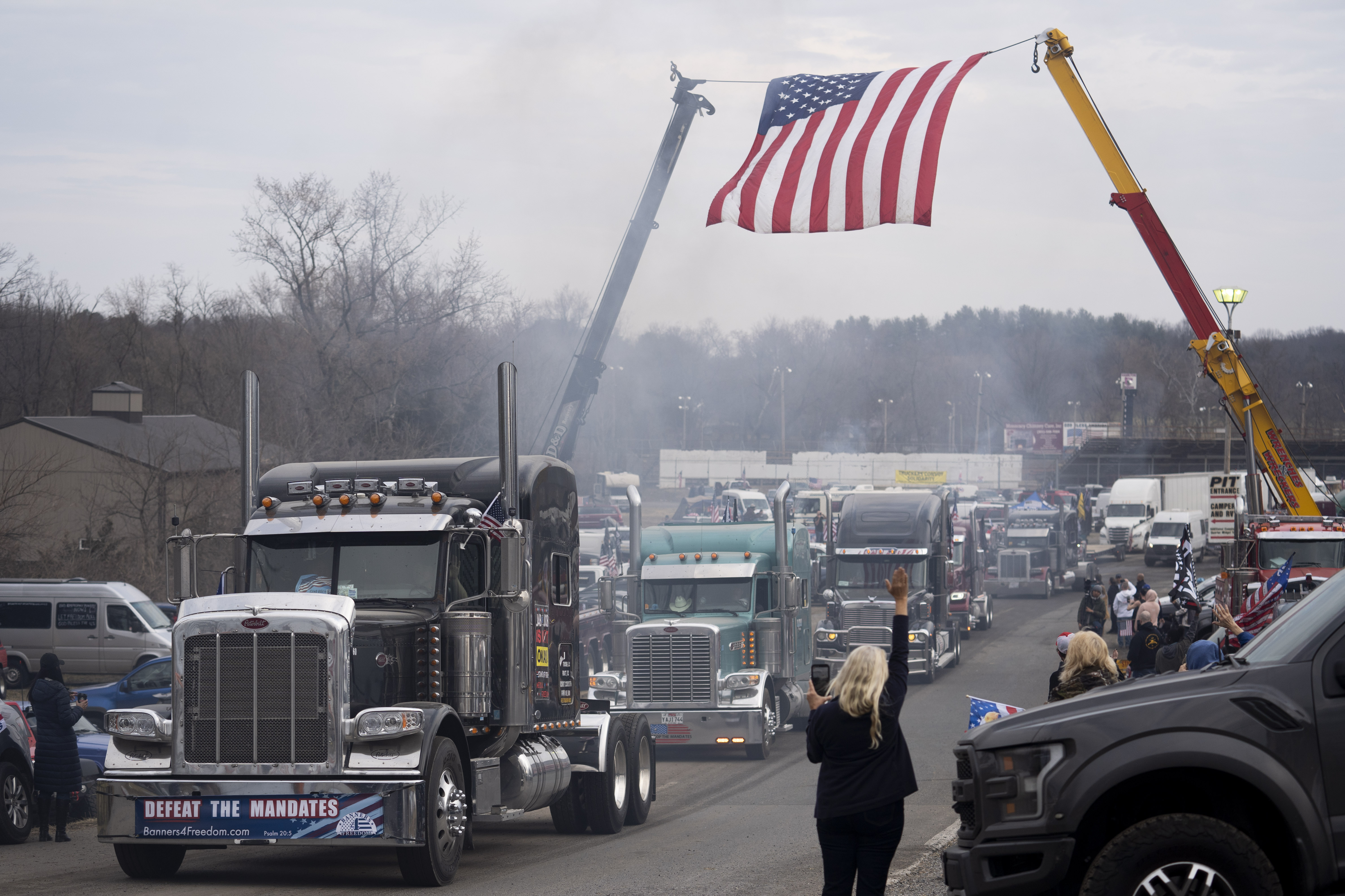 新华社照片,华盛顿,2022年3月12日 (国际·图文互动)(1)通讯:“这不是科学而是政治学” 3月6日,在美国马里兰州的黑格斯敦,抗议美国应对新冠疫情政策措施的卡车队伍集结出发。 (配本社同题文字稿) 新华社记者 刘杰 摄