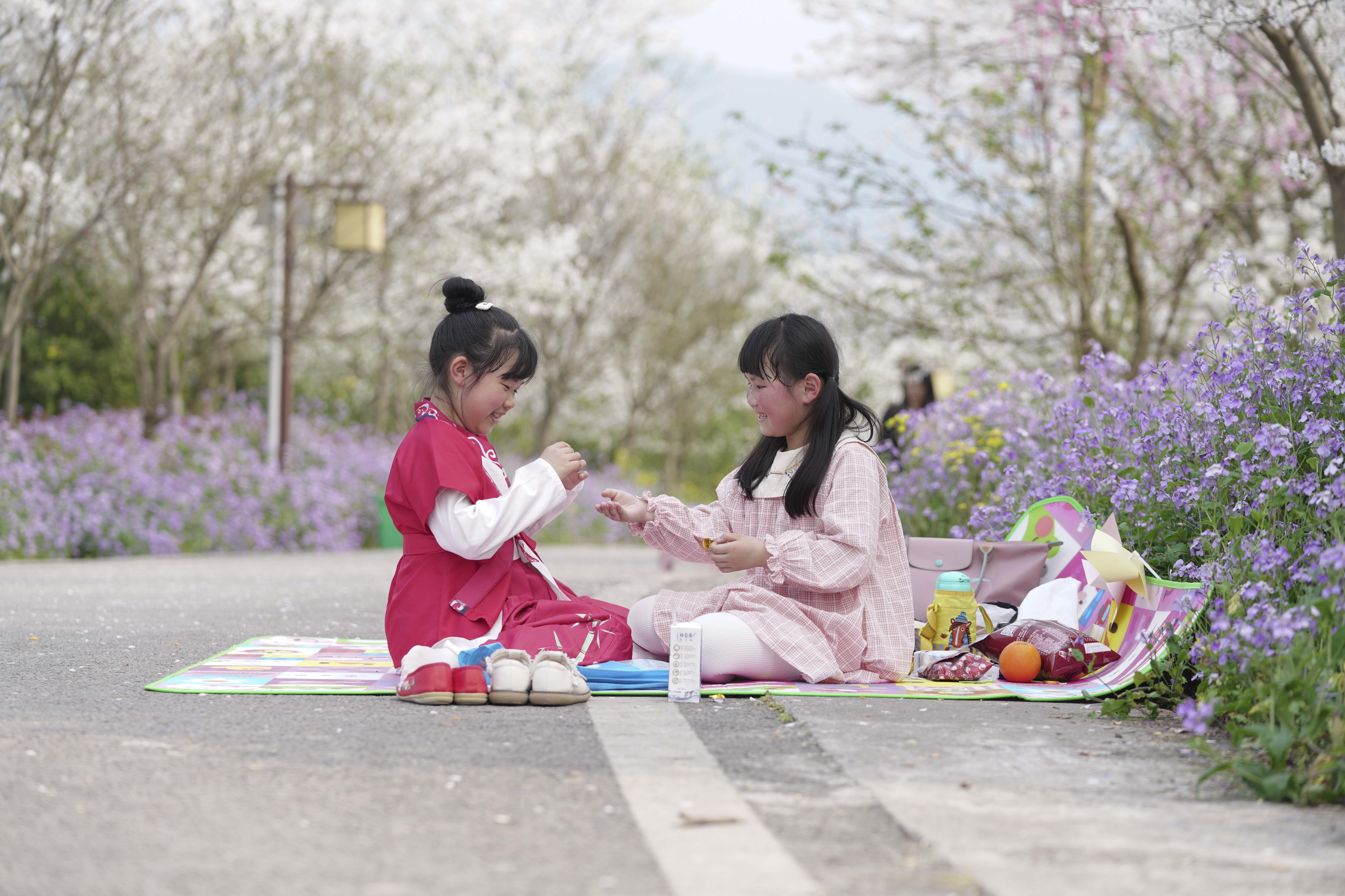 新华社照片,重庆,2022年3月12日 花开春色美 3月12日,小朋友在重庆市北碚区澄江镇五一村游玩。 眼下,南方各地春意盎然,繁花似锦。 新华社发(秦廷富摄)