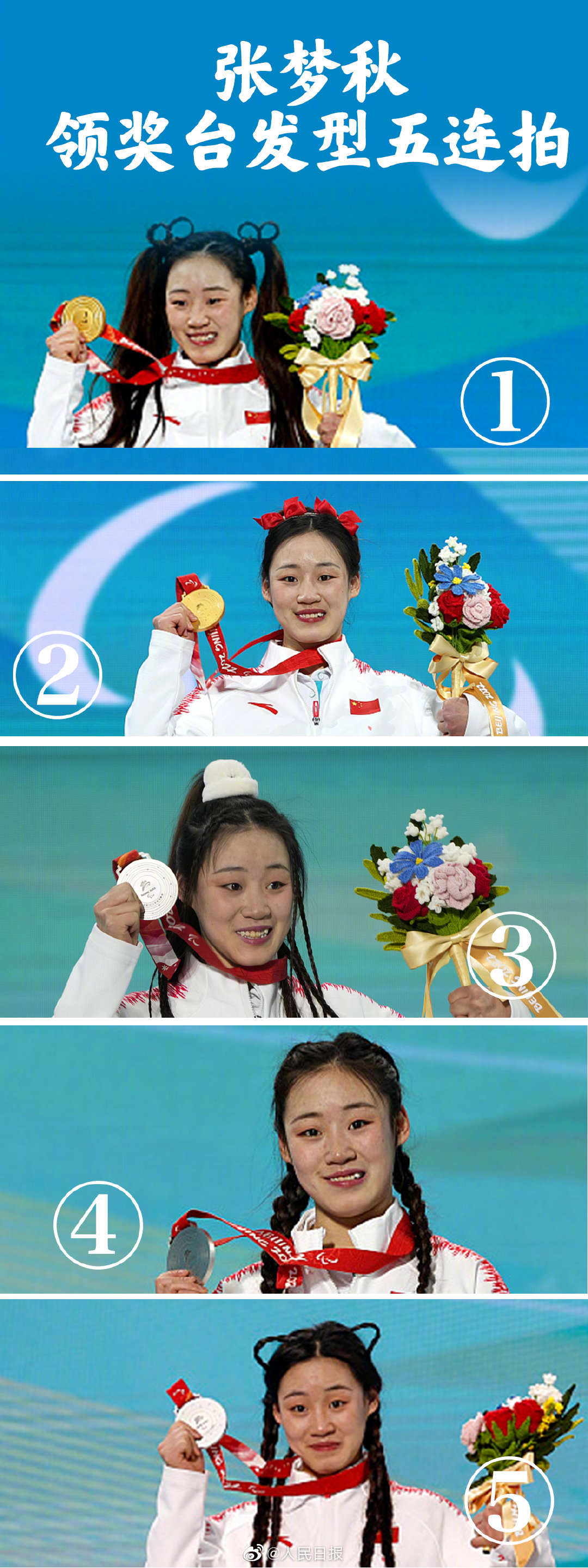 北京冬残奥会上张梦秋已摘2金3银,每次登上领奖台都会梳不同的发型。今天的颁奖仪式上,她又换了新发型。恭喜张梦秋!