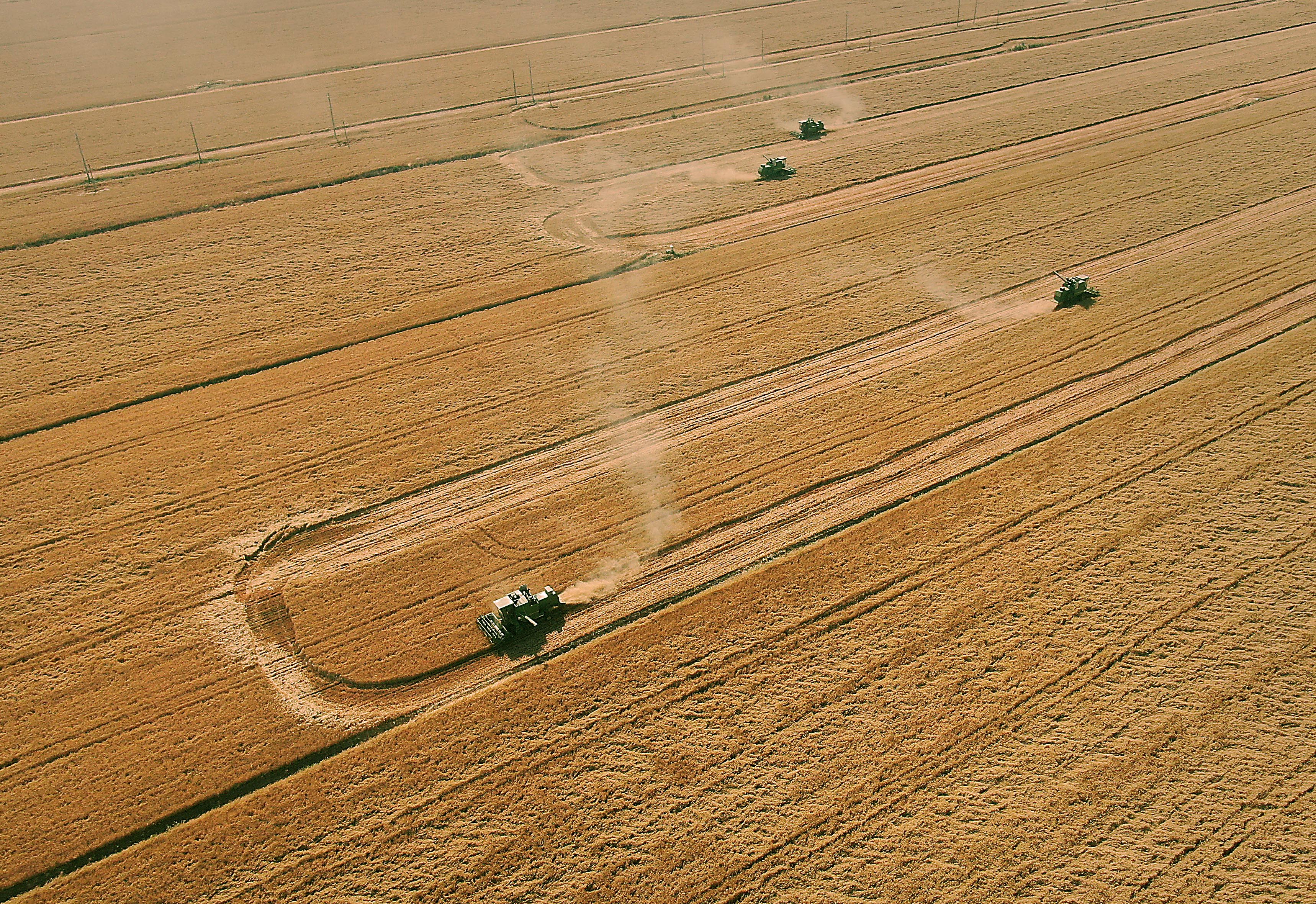 新华社照片,北京,2022年3月12日 新华社评论员:激荡团结奋斗的强大正能量 在河南省黄泛区农场九分场的麦田里,农机手操作收割机收获小麦(2021年6月6日摄,无人机照片)。 (配本社同题文字稿) 新华社记者 李安 摄