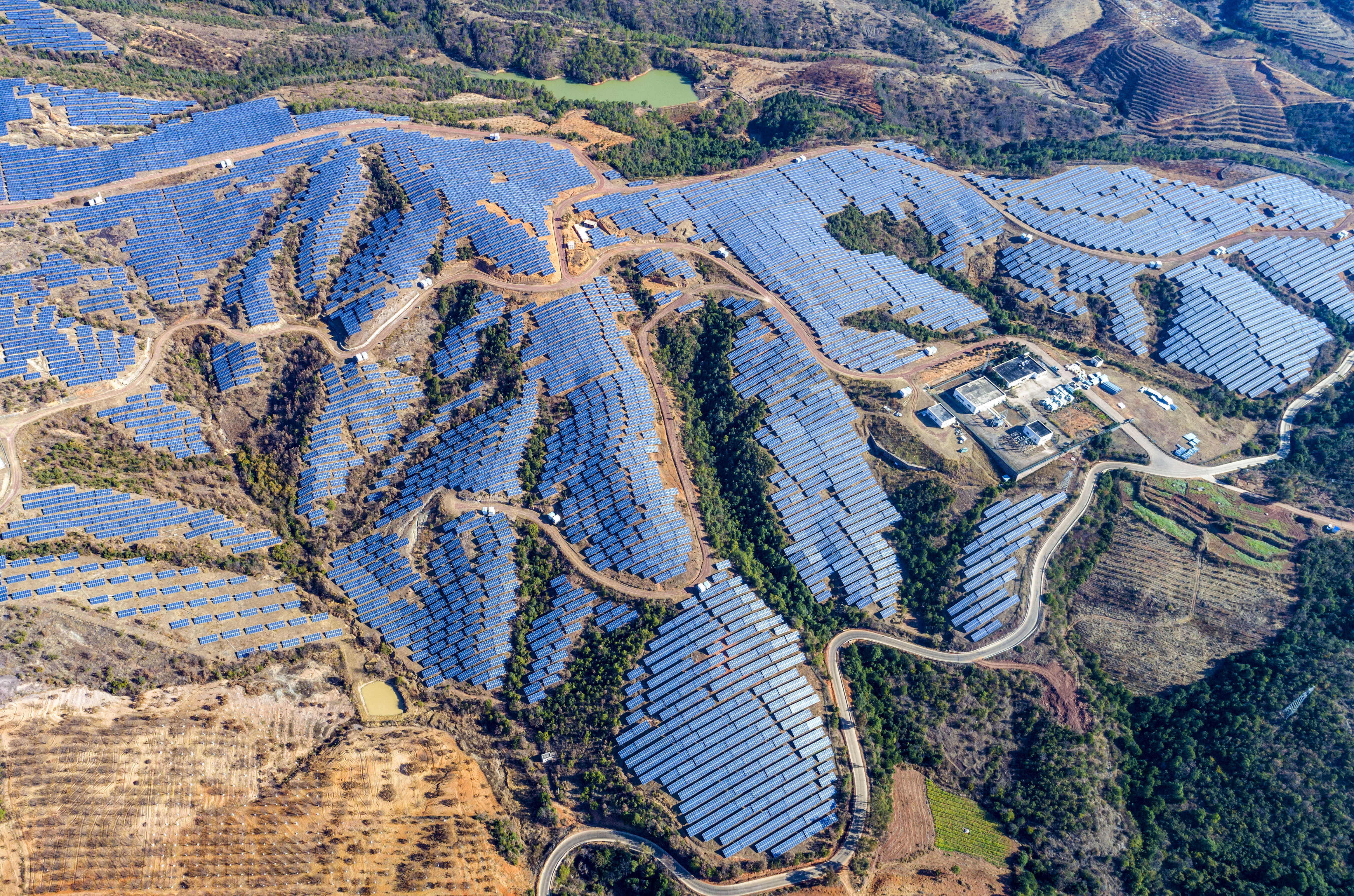 新华社照片,北京,2022年3月12日 新华社评论员:激荡团结奋斗的强大正能量 2月16日拍摄的位于云南省楚雄彝族自治州永仁县维的乡的一处光伏电站(无人机照片)。 (配本社同题文字稿) 新华社记者 陈欣波 摄