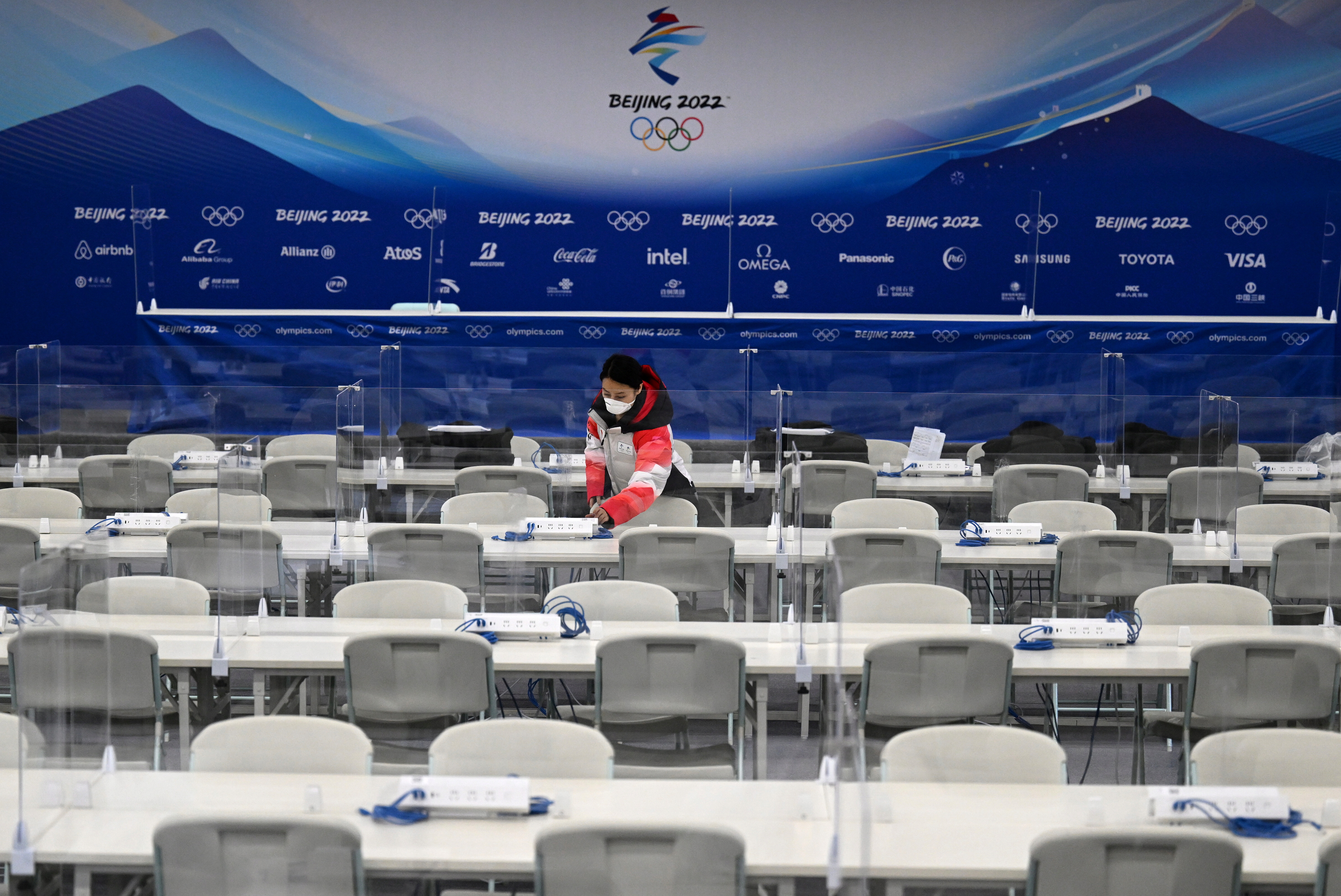 国家高山滑雪中心场馆媒体中心工作人员滕薇在查看新闻发布厅设备安装情况(1月27日摄)。新华社记者陈斌摄